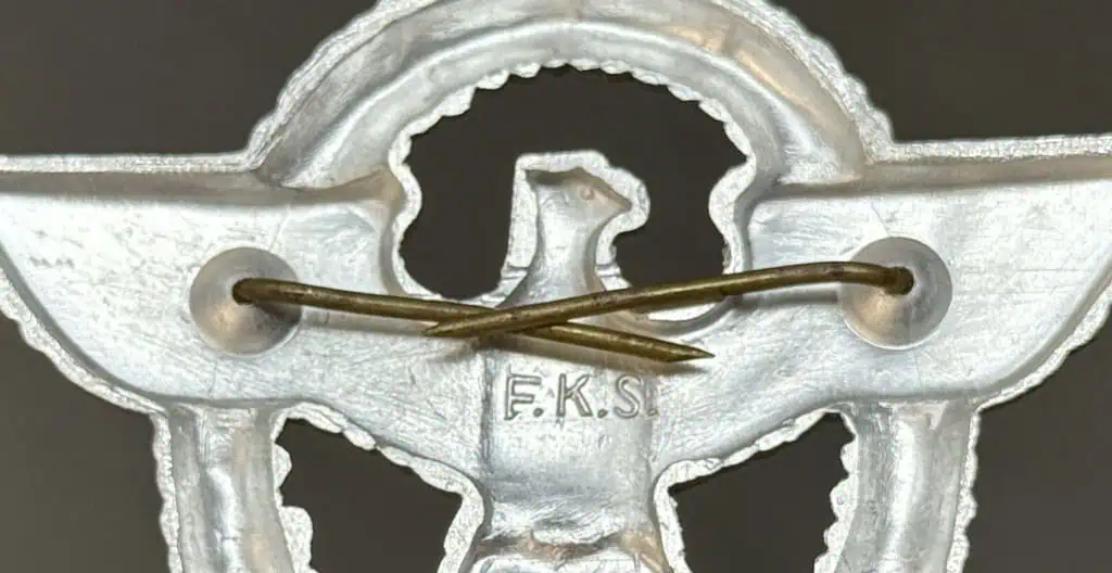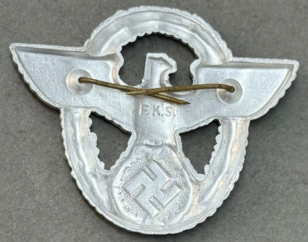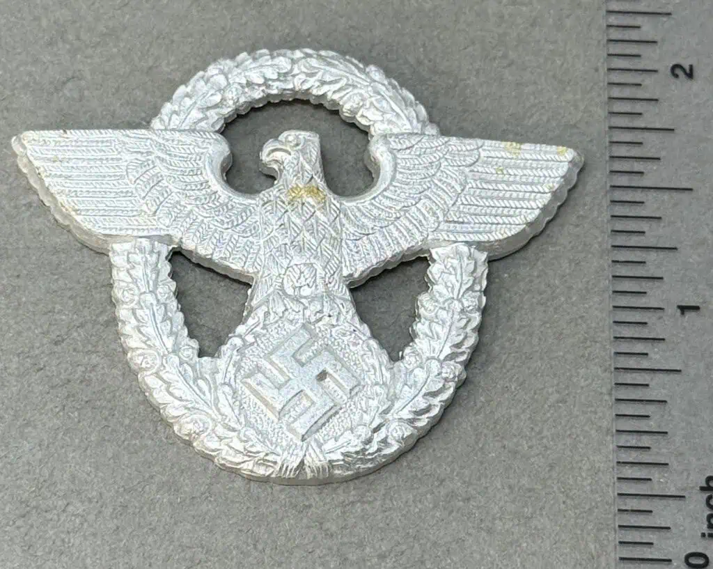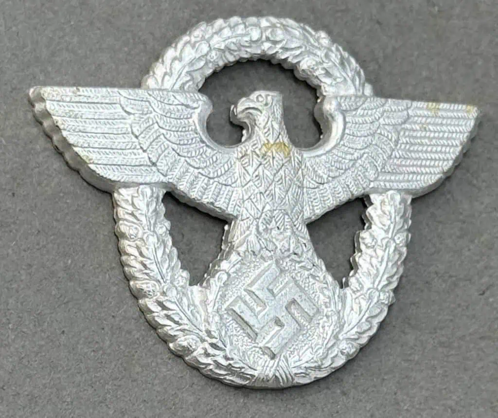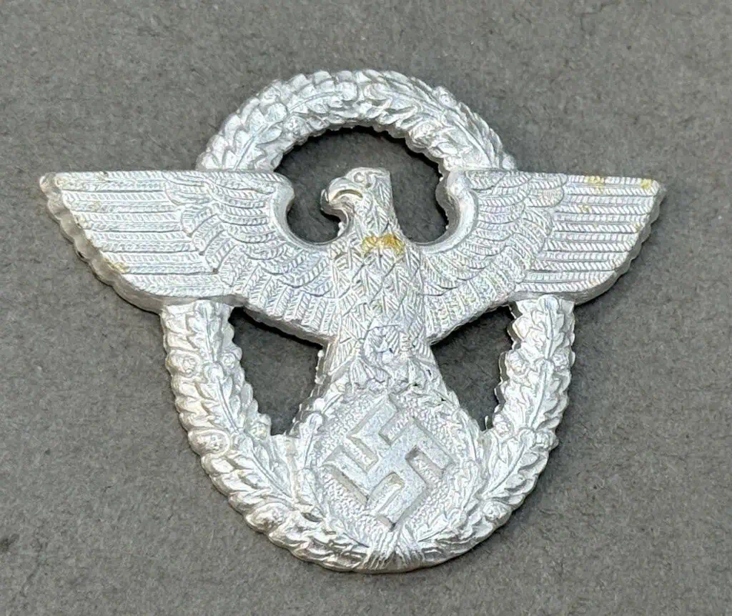Original German NSDAP (NAZI PARTY) Type-2 POLICE VISOR CAP EAGLE (Mützenadler) Certified. Shortly after Adolf Hitler and the NSDAP, Nationalsozialistische Deutsche Arbeiterpartei, (National Socialist German Worker’s Party), ascended to the leadership of Germany, the police, as with almost all civic organizations, incorporated the new style national eagle and swastika on their insignia. The first pattern police insignia to utilize the new style national eagle and swastika was introduced on April 23RD 1934. On June 17TH 1936, Reichsführer-SS Heinrich Himmler was appointed to the newly created position of Chef der Deutschen Polizei im Reichsministerium des Innern, (Chief of the German Police in the National Ministry of the Interior), effectively giving him full control of all police agencies within Germany. As a result of this appointment and the restructuring of all the separate German state police into a single national police force new regulations were instituted to bring about uniformity in dress for all police through-out the country. One of the new uniform regulations of June 25TH 1936 was the introduction of a slightly modified second pattern police eagle and swastika to replace the first pattern. The police pattern national eagle was worn on all types of headgear including the visor caps, overseas cap and the M43 field cap. The insignia utilized on the visor caps was of stamped metal construction while the insignia on the soft caps was machined or handstitched. Second pattern, police cap eagle as introduced on June 25TH 1936 to replace the earlier, (Circa April 1934-June 1936), first pattern cap eagle. The single piece, silver washed, die stamped, aluminum alloy construction, right facing eagle features out-stretched wings and is clutching a canted swastika in its talons. The eagle is superimposed on an embossed, vertically oval, oak-leaf wreath with the eagle’s wings extending beyond the outer edges of the wreath with a roughly, 55mm wingspan. The eagle and the wreath both have nice high relief detailing, and the insignia is slightly convex to fit the contours of a cap! Both of the two original attachment prongs intact. 100% Guaranteed to be authentic Brought home by a U.S. solider as a trophy of war. Complete museum documentation (COA) Provided. Certified by The Gettysburg Museum of History. The Gettysburg Museum of History does not support or condone Adolf Hitler or the Nazi Party and is only offering this as a historic relic. Please see our other items. Also note when browsing our web site there are several pages of items, at the bottom of the list look for other page numbers. Nicely maker marked. OUTSTANDING Maker Marked Example! see photos Don’t Miss It!