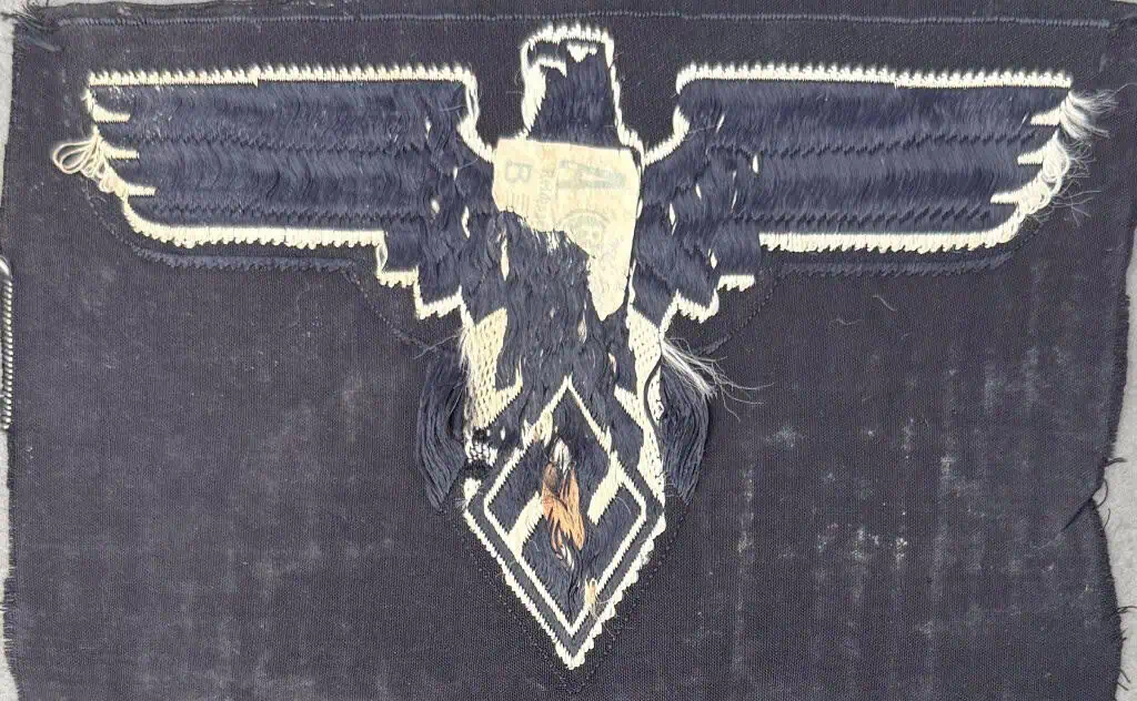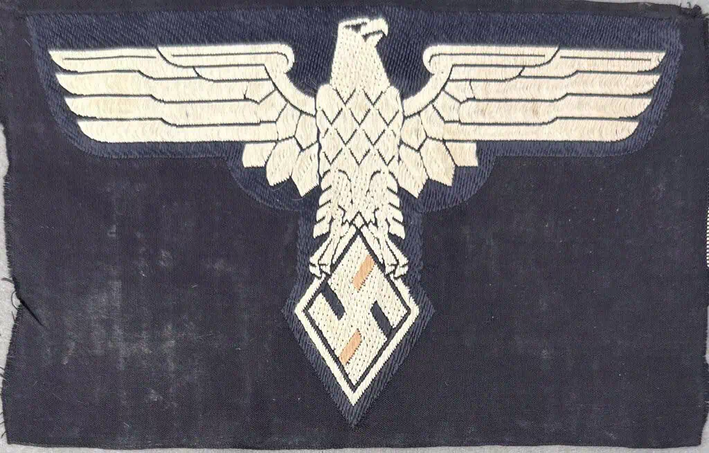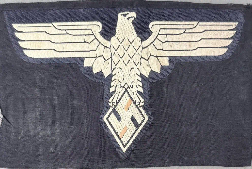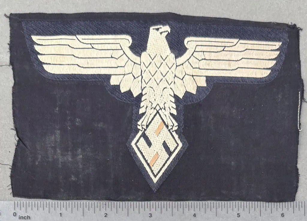 Original WWII German Hitler Youth NSDStB SPORTS SHIRT EAGLE. (NSDStB Sportabzeichen) Brought Home By A U.S. Veteran Certified. The NSDStB, National Socialist Deutscher Studentenbund, (National Socialist German Students League), was established in February 1926 at the University of Munich to supply the appropriate political leadership to the student bodies of the Germany Universities. In July 1928 leadership of the Studentenbund was taken over by Reichsjugendführer Baldur von Schirach who organized the membership along military lines. Originally personnel had to be an NSDAP member to enroll in the Studentenbund but this requirement was withdrawn in 1929. NSDStB sports shirt eagle. Approximately 150mm x 100mm. Machine woven in white, black and red rayon. Still attached to original factory roll backing. Still has part of the original paper RZM tag!  Nice BIG EAGLE! Some storage wear  but very nice!  Nice example showing the expected minor age in overall good condition. One of the classic desirable collector’s items   from the third Reich in used but in good but used condition.   Gettysburg Museum Certified (COA) provided.   100% Guaranteed to be authentic. Sold for historic purposes only. See our other pieces on our web site.    Also note when browsing our web site there are several pages of items, at the bottom of the list look for other page numbers. RARE EAGLE!  don’t miss it! Very rare with a partial  RZM tag!