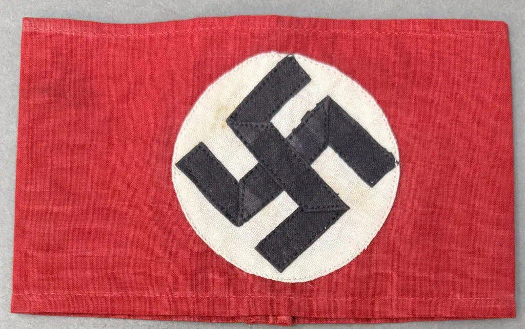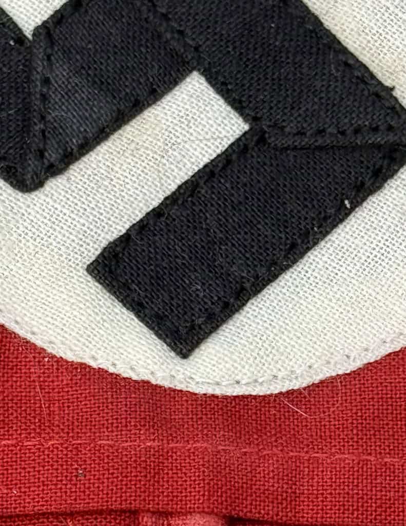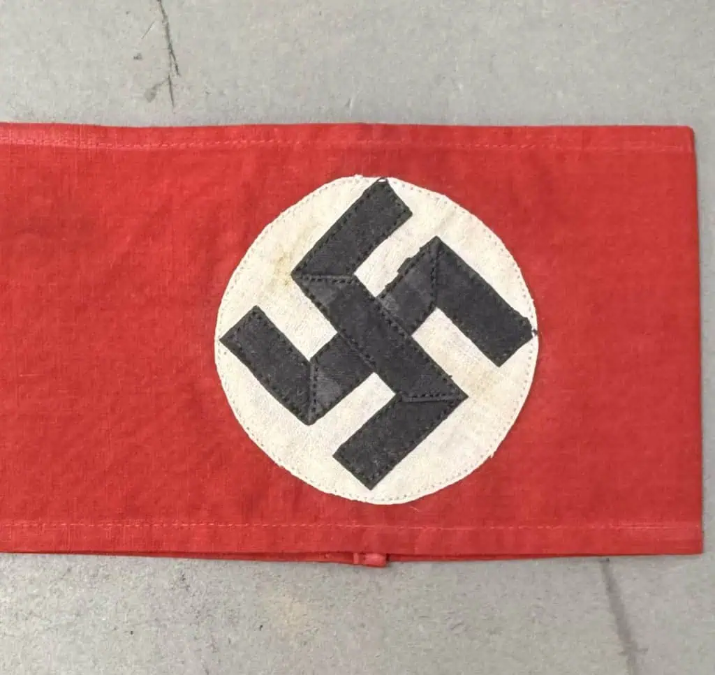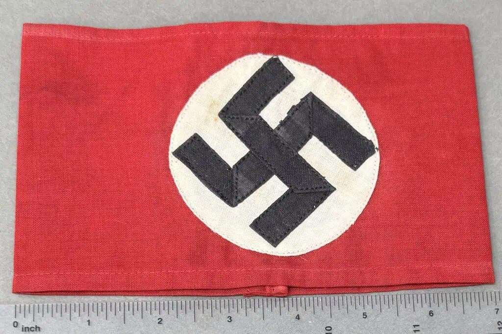 Original WWII Nazi German Multi-piece Construction Armband in good used condition. Some light wear from storage. Deluxe multi-piece version of the Nazi Arm Band. The most recognizable pieces of insignia associated with the Nazi regime is the swastika armband. Utilized by pretty much by all the organization of the Third Reich in one form or another. The swastika, (a Sanskrit word meaning “well-being”), is an ancient symbol that was utilized in numerous diverse cultures and signified both the cycle of life and the sun. The swastika was also a Nordic rune and the pagan Germanic symbol for Thor, God of Adventurers. A high-quality cotton cloth materiel. approximately 9cm diameter separate piece sewn white disk, and high-quality multi piece swastika (SEE PHOTOS) A nice quality example. A very good earlier example. Gettysburg Museum Certified (COA) provided. Rare 100% Guaranteed to be authentic. Sold for historic purposes only. See our other pieces on our web site. Some storage wear, Also note when browsing our web site there are several pages of items, at the bottom of the list look for other page numbers. . Do not miss this one! Armbands and are in HIGH DEMAND! Don’t Miss it! Good Used EXAMPLE some slight soiling
