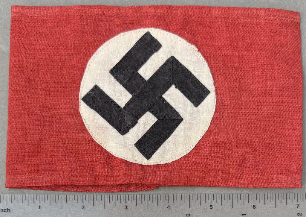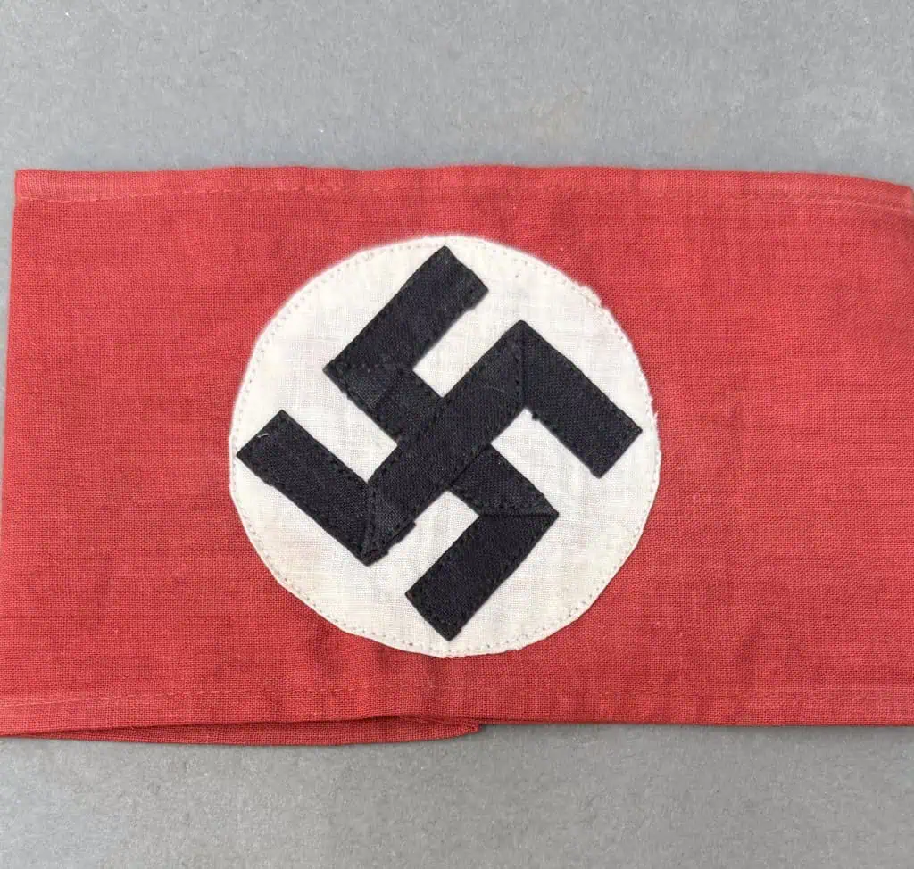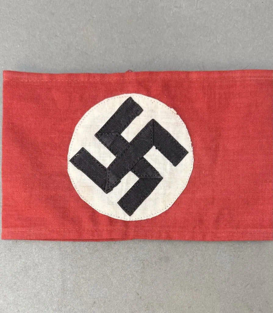 Original WWII Nazi German Multi-piece Construction Armband  in good used condition. Some light wear from storage.  Deluxe multi-piece version of the Nazi Arm Band.  The most recognizable pieces of insignia associated with the Nazi regime is the swastika armband. Utilized by pretty much by all the organization of the Third Reich in one form or another. The swastika, (a Sanskrit word meaning “well-being”), is an ancient symbol that was utilized in numerous diverse cultures and signified both the cycle of life and the sun. The swastika was also a Nordic rune and the pagan Germanic symbol for Thor, God of Adventurers.   A high-quality cotton cloth materiel. approximately 9cm diameter separate piece sewn white disk, and  high-quality multi piece swastika (SEE PHOTOS) A nice quality example. A very good earlier example. Gettysburg Museum Certified (COA) provided. Rare 100% Guaranteed to be authentic.  Sold for historic purposes only. See our other pieces on our web site. Some  storage wear,  Also note when browsing our web site there are several pages of items, at the bottom of the list look for other page numbers. . Do not miss this one!  Armbands and are in HIGH DEMAND! Don’t Miss it! Good Used  EXAMPLE some slight soiling