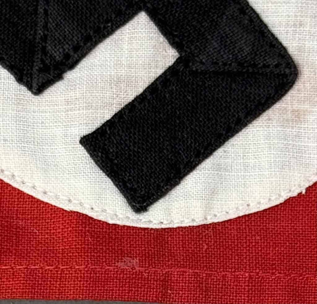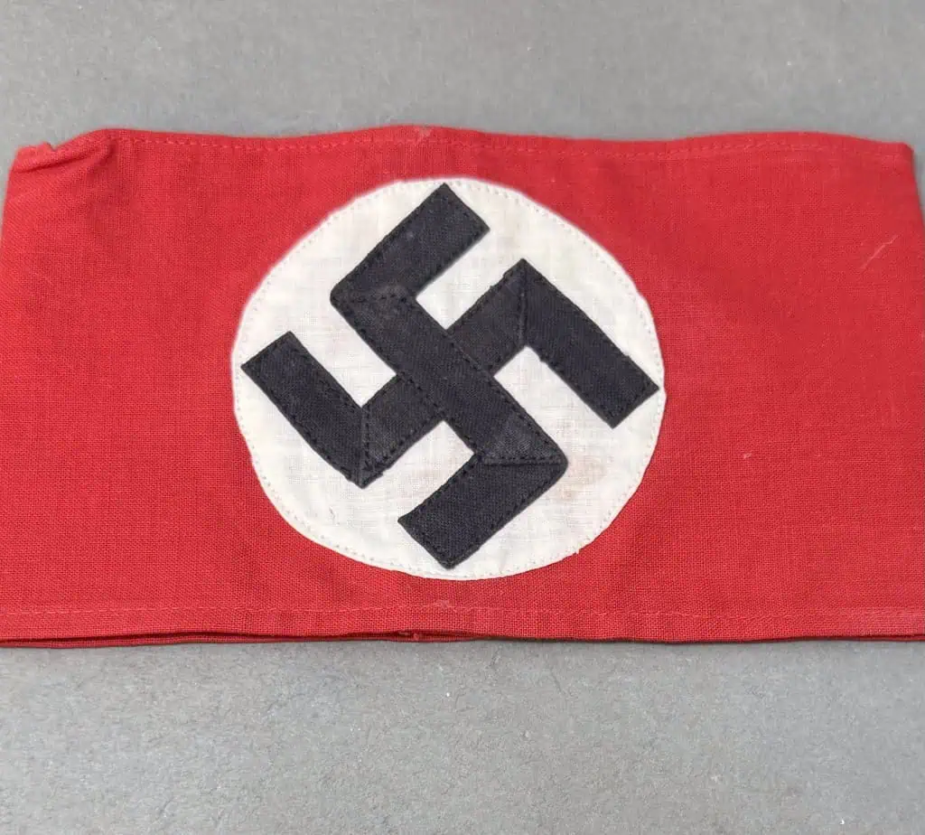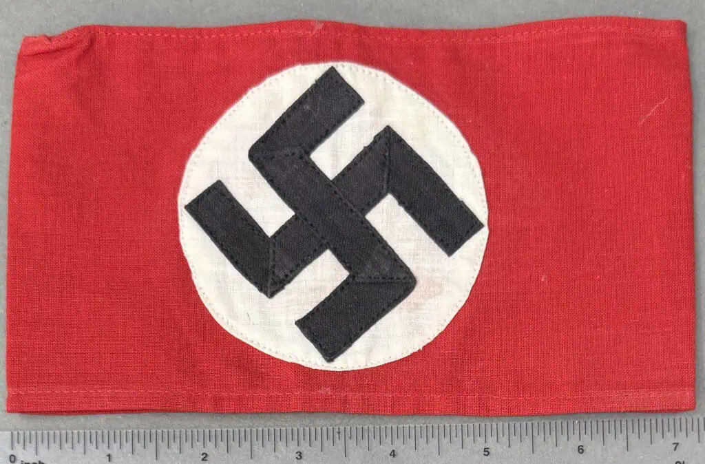 Original WWII Nazi German Multi-piece Construction Armband in good used condition. Some light wear from storage. Deluxe multi-piece version of the Nazi Arm Band. The most recognizable pieces of insignia associated with the Nazi regime is the swastika armband. Utilized by pretty much by all the organization of the Third Reich in one form or another. The swastika, (a Sanskrit word meaning “well-being”), is an ancient symbol that was utilized in numerous diverse cultures and signified both the cycle of life and the sun. The swastika was also a Nordic rune and the pagan Germanic symbol for Thor, God of Adventurers. A high-quality cotton cloth materiel. approximately 9cm diameter separate piece sewn white disk, and high-quality multi piece swastika (SEE PHOTOS) A nice quality example. A very good earlier example. Gettysburg Museum Certified (COA) provided. Rare 100% Guaranteed to be authentic. Sold for historic purposes only. See our other pieces on our web site. Some storage wear, Also note when browsing our web site there are several pages of items, at the bottom of the list look for other page numbers. . Do not miss this one! Armbands and are in HIGH DEMAND! Don’t Miss it! Good Used EXAMPLE