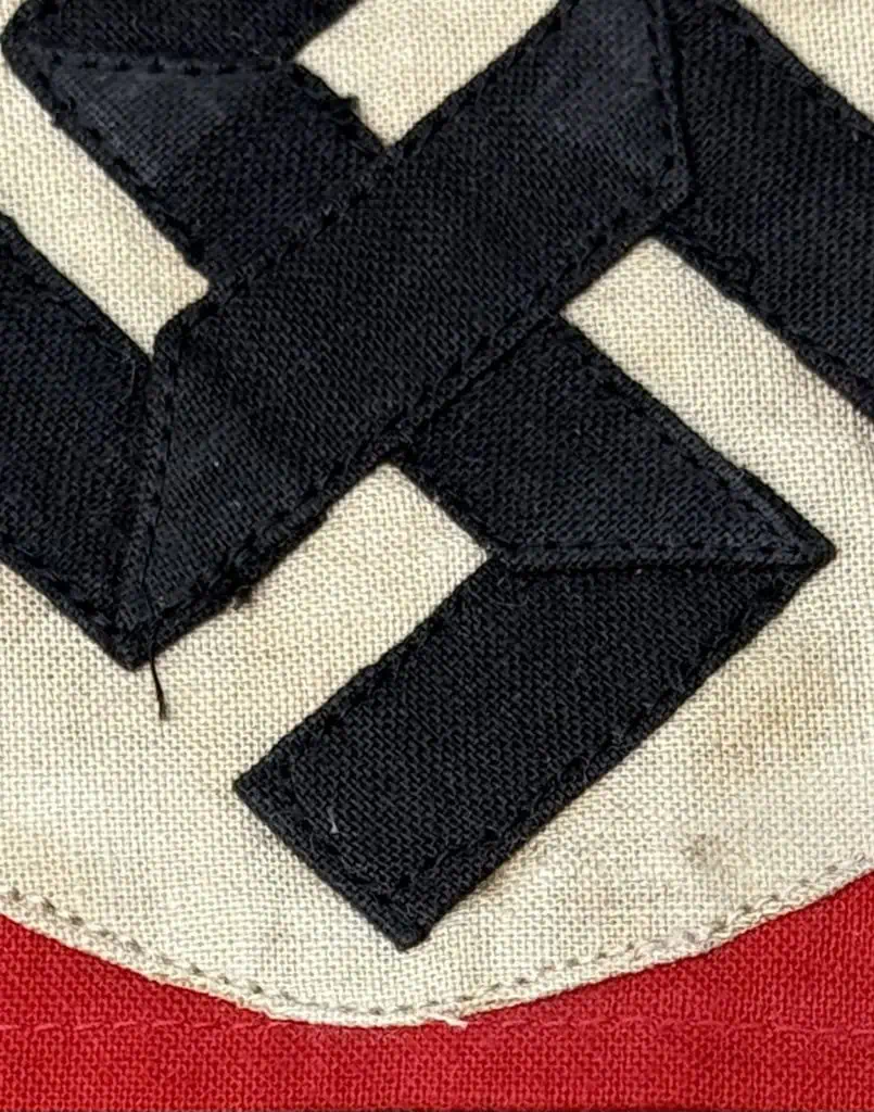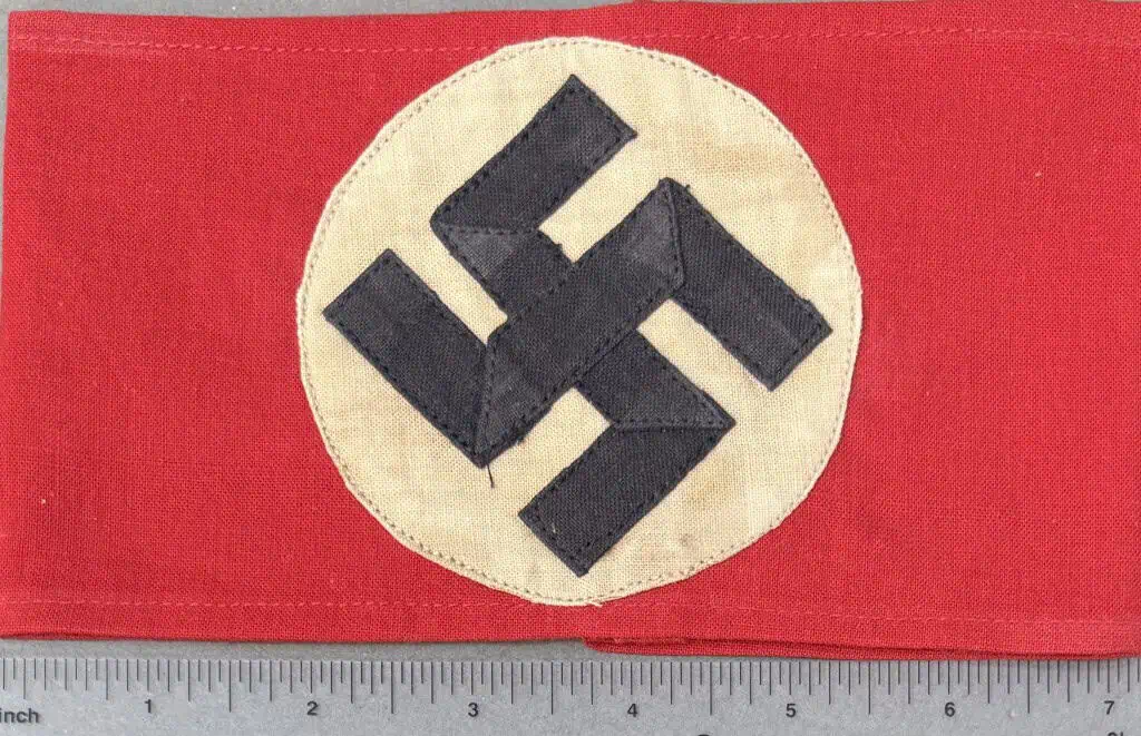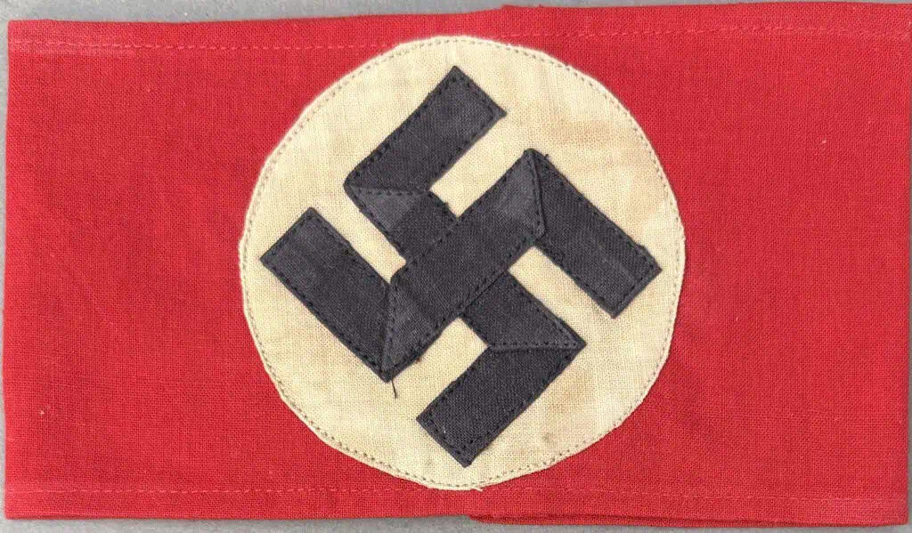 Original WWII Nazi German Multi-piece Construction Armband in good used condition. Some light wear from storage. Deluxe multi-piece version of the Nazi Arm Band. The most recognizable pieces of insignia associated with the Nazi regime is the swastika armband. Utilized by pretty much by all the organization of the Third Reich in one form or another. The swastika, (a Sanskrit word meaning “well-being”), is an ancient symbol that was utilized in numerous diverse cultures and signified both the cycle of life and the sun. The swastika was also a Nordic rune and the pagan Germanic symbol for Thor, God of Adventurers. A high-quality cotton cloth materiel. approximately 9cm diameter separate piece sewn white disk, and high-quality multi piece swastika (SEE PHOTOS) A nice quality example. A very good earlier example. Gettysburg Museum Certified (COA) provided. Rare 100% Guaranteed to be authentic. Sold for historic purposes only. See our other pieces on our web site. Some storage wear, Also note when browsing our web site there are several pages of items, at the bottom of the list look for other page numbers. . Do not miss this one! Armbands and are in HIGH DEMAND! Don’t Miss it! Good Used EXAMPLE