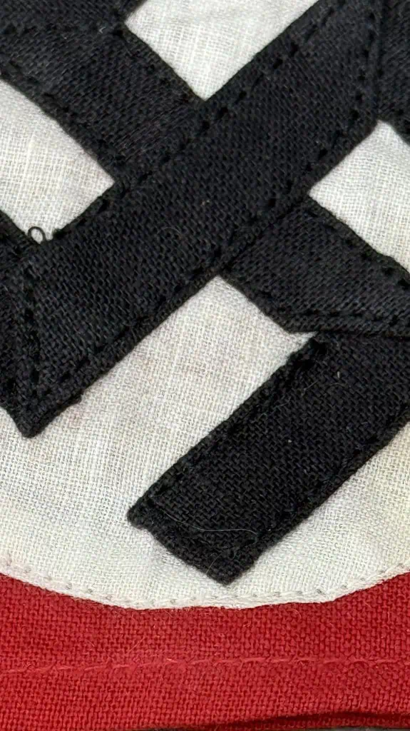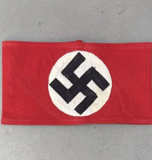 Original WWII Nazi German Multi-piece Construction Armband  in good used condition. Some light wear from storage.  Deluxe multi-piece version of the Nazi Arm Band.  The most recognizable pieces of insignia associated with the Nazi regime is the swastika armband. Utilized by pretty much by all the organization of the Third Reich in one form or another. The swastika, (a Sanskrit word meaning “well-being”), is an ancient symbol that was utilized in numerous diverse cultures and signified both the cycle of life and the sun. The swastika was also a Nordic rune and the pagan Germanic symbol for Thor, God of Adventurers.   A high-quality cotton cloth materiel. approximately 9cm diameter separate piece sewn white disk, and  high-quality multi piece swastika (SEE PHOTOS) A nice quality example. A very good earlier example. Gettysburg Museum Certified (COA) provided. Rare 100% Guaranteed to be authentic.  Sold for historic purposes only. See our other pieces on our web site. Some  storage wear,  Also note when browsing our web site there are several pages of items, at the bottom of the list look for other page numbers. . Do not miss this one!  Armbands and are in HIGH DEMAND! Don’t Miss it! Good Used  EXAMPLE