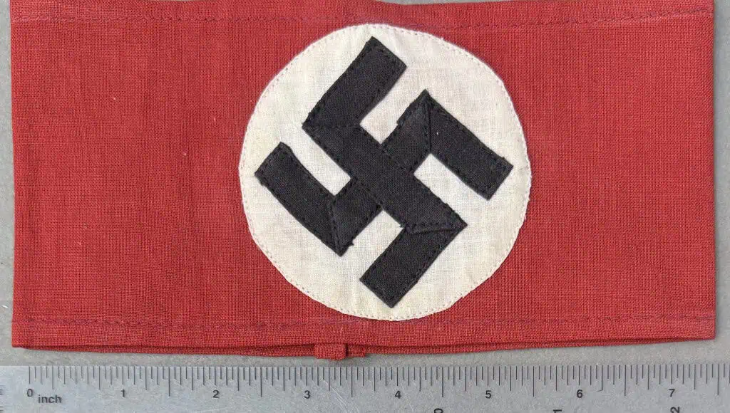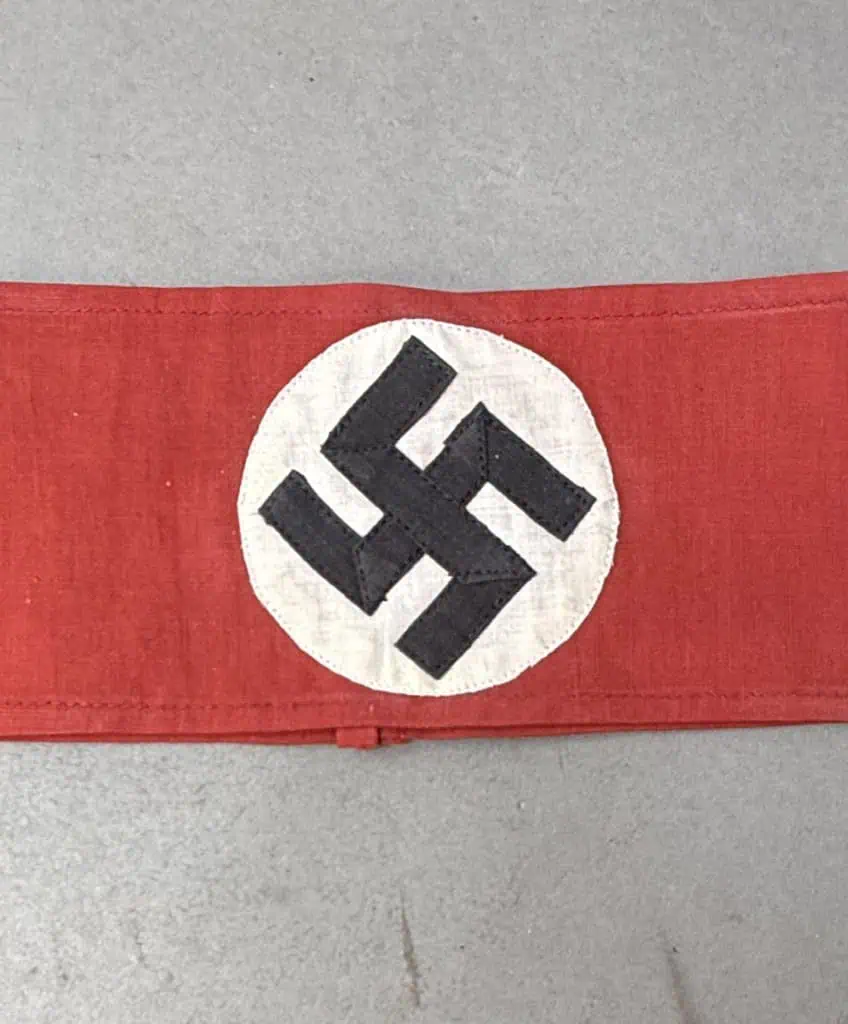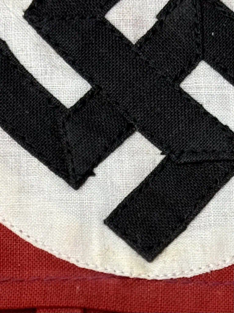 Original WWII Nazi German Multi-piece Construction Armband in good used condition. Some light wear from storage. Deluxe multi-piece version of the Nazi Arm Band. The most recognizable pieces of insignia associated with the Nazi regime is the swastika armband. Utilized by pretty much by all the organization of the Third Reich in one form or another. The swastika, (a Sanskrit word meaning “well-being”), is an ancient symbol that was utilized in numerous diverse cultures and signified both the cycle of life and the sun. The swastika was also a Nordic rune and the pagan Germanic symbol for Thor, God of Adventurers. A high-quality cotton cloth materiel. approximately 9cm diameter separate piece sewn white disk, and high-quality multi piece swastika (SEE PHOTOS) A nice quality example. A very good earlier example. Gettysburg Museum Certified (COA) provided. Rare 100% Guaranteed to be authentic. Sold for historic purposes only. See our other pieces on our web site. Some storage wear, Also note when browsing our web site there are several pages of items, at the bottom of the list look for other page numbers. . Do not miss this one! Armbands and are in HIGH DEMAND! Don’t Miss it! Good Used EXAMPLE