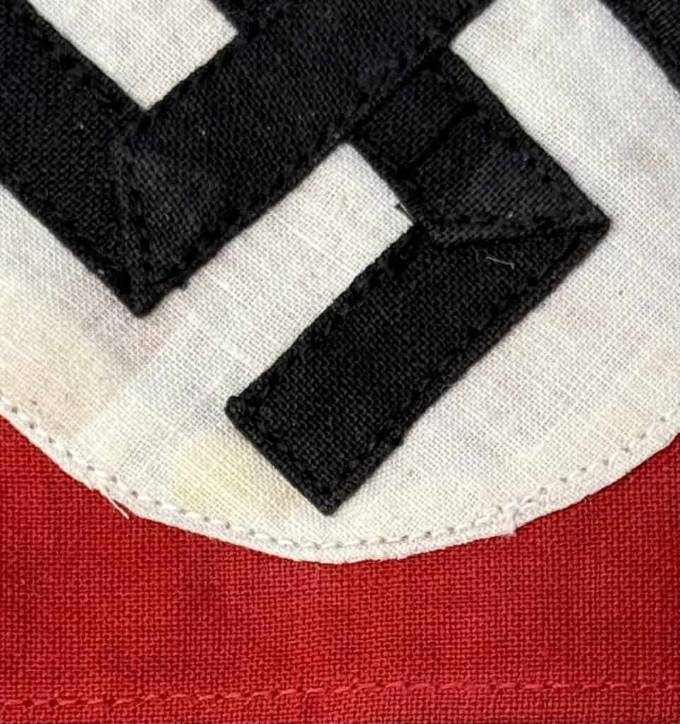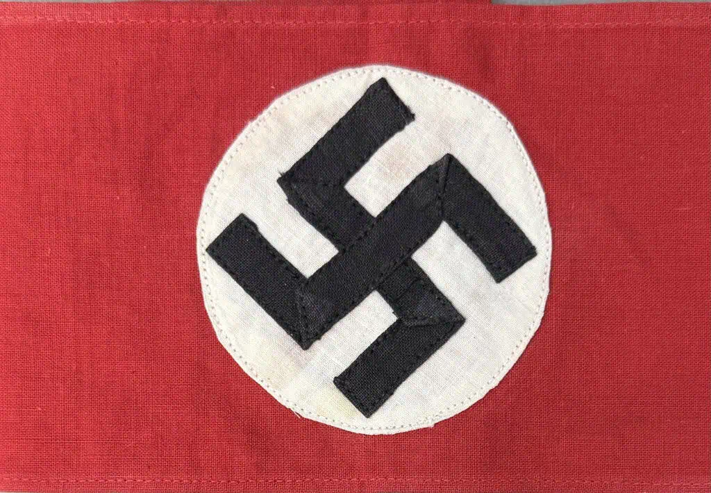 Original WWII Nazi German Multi-piece Construction Armband in good used condition. Some light wear from storage. Deluxe multi-piece version of the Nazi Arm Band. The most recognizable pieces of insignia associated with the Nazi regime is the swastika armband. Utilized by pretty much by all the organization of the Third Reich in one form or another. The swastika, (a Sanskrit word meaning “well-being”), is an ancient symbol that was utilized in numerous diverse cultures and signified both the cycle of life and the sun. The swastika was also a Nordic rune and the pagan Germanic symbol for Thor, God of Adventurers. A high-quality cotton cloth materiel. approximately 9cm diameter separate piece sewn white disk, and high-quality multi piece swastika (SEE PHOTOS) A nice quality example. A very good earlier example. Gettysburg Museum Certified (COA) provided. Rare 100% Guaranteed to be authentic. Sold for historic purposes only. See our other pieces on our web site. Some storage wear, Also note when browsing our web site there are several pages of items, at the bottom of the list look for other page numbers. . Do not miss this one! Armbands and are in HIGH DEMAND! Don’t Miss it! Good Used EXAMPLE