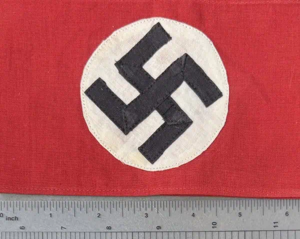 Original WWII Nazi German Multi-piece Construction Armband in good used condition. Some light wear from storage. Deluxe multi-piece version of the Nazi Arm Band. The most recognizable pieces of insignia associated with the Nazi regime is the swastika armband. Utilized by pretty much by all the organization of the Third Reich in one form or another. The swastika, (a Sanskrit word meaning “well-being”), is an ancient symbol that was utilized in numerous diverse cultures and signified both the cycle of life and the sun. The swastika was also a Nordic rune and the pagan Germanic symbol for Thor, God of Adventurers. A high-quality cotton cloth materiel. approximately 9cm diameter separate piece sewn white disk, and high-quality multi piece swastika (SEE PHOTOS) A nice quality example. A very good earlier example. Gettysburg Museum Certified (COA) provided. Rare 100% Guaranteed to be authentic. Sold for historic purposes only. See our other pieces on our web site. Some storage wear, Also note when browsing our web site there are several pages of items, at the bottom of the list look for other page numbers. . Do not miss this one! Armbands and are in HIGH DEMAND! Don’t Miss it! Good Used EXAMPLE