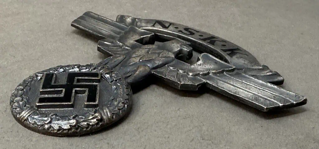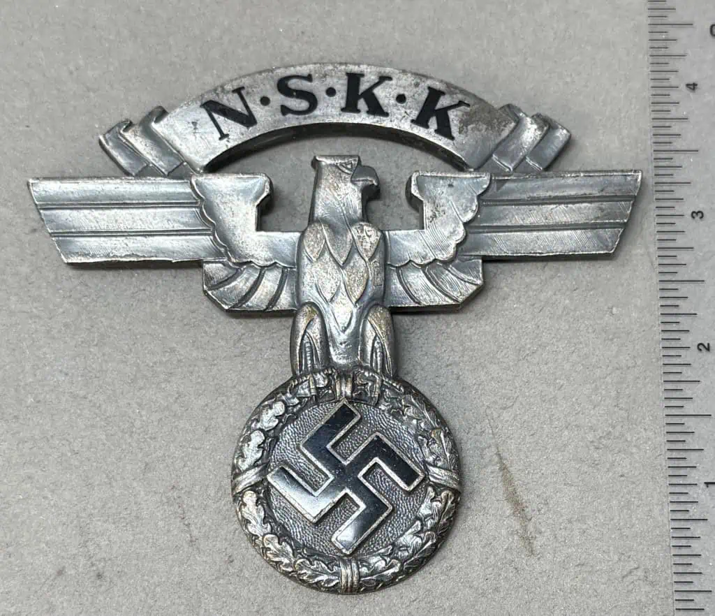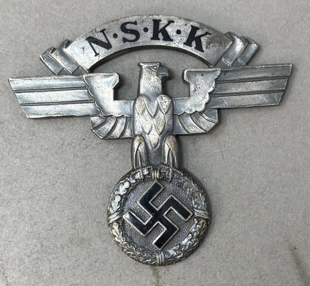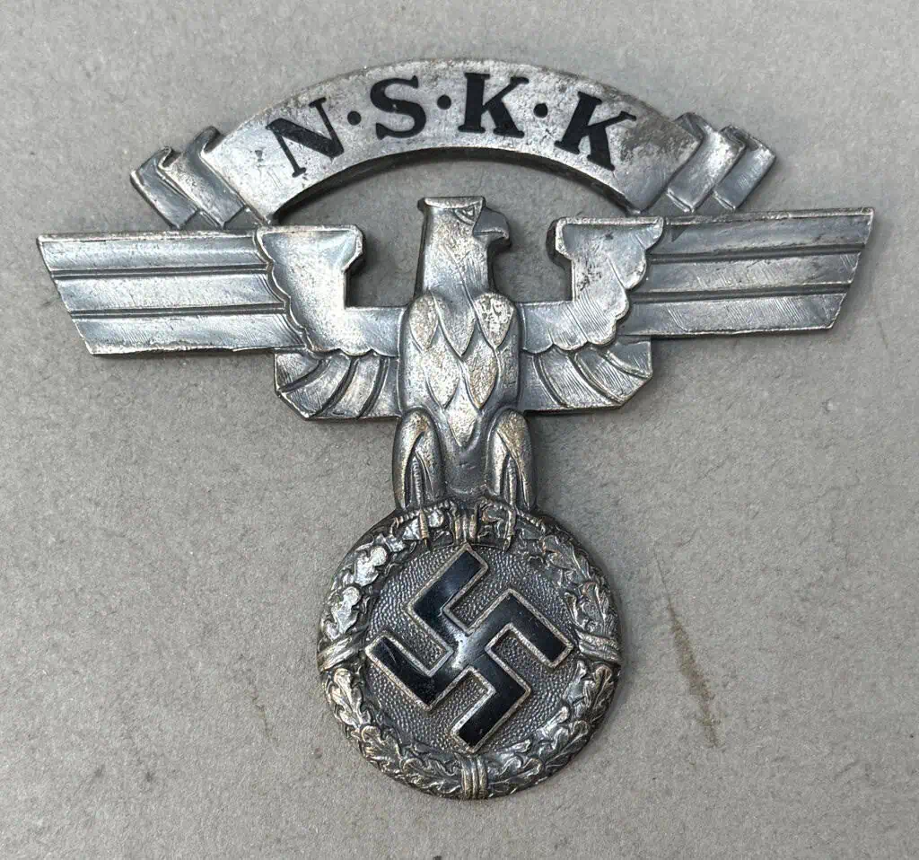 Original High Quality Third Reich NSKK PLAQUE EAGLE. (Schmuckplatte Adler) For Vehicles Certified. The development of the NSKK, National Sozialistisches Kraftfahr Korps, (National Socialist Motor Corps), can be traced back to 1923 when the SA introduced a Kraftfahr Abteilung, (Motor Section), to transport personnel as required. In 1928 the SA Motor section was expanded to Kraftfahrstaffeln, (Motor Squadrons). In an attempt to create a national motor corps the NSAK, National Sozialistisches Automobil Korps, (National Socialist Automobile Corps), was formed in April 1930 as a NSDAP auxiliary organization subordinate to the SA. In early 1931 Adolf Hühnlein was appointed as Chief of the NSAK and proposed a name change to NSKK, which was officially accepted in April 1931. The NSKK was formally formed in April 1931, and adopted the crash helmet that had been worn by the Motor-SA units as early as 1928. The only modification to the helmet was the insignia used. A roughly 11.5cm x 10cm, nickel-silver plated alloy eagle and swastika surmounted by a banner reading “N.S.K.K.” . Eagle has three holes for mounting now removed possibly for a wall plaque or desk ornament). Would make an excellent centerpiece for an NSKK insignia display! VERY HEAVY HIGH QUALITY FOR VEHICLES not to be confused with the lightweight helmet eagles. In good but used condition Gettysburg Museum Certified (COA) provided. Rare 100% Guaranteed to be authentic. Sold for historic purposes only. See our other pieces on our web site. Also note when browsing our web site there are several pages of items, at the bottom of the list look for other page numbers. Excellent Rare EXAMPLE VERY NICE looking early eagle! BIG!