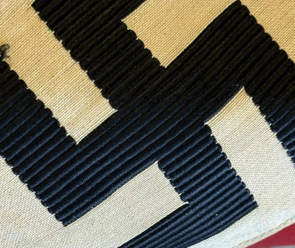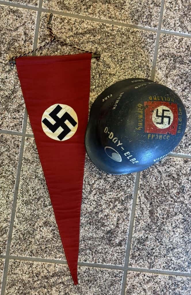 Original Third Reich Era German NSDAP (Nazi Party) Cloth Wall Pennant Type Flag Brought Home By A U.S. Veteran Certified. Utilized by pretty much by all the organization of the Third Reich in one form or another. The swastika, (a Sanskrit word meaning “well-being”), is an ancient symbol that was utilized in numerous diverse cultures and signified both the cycle of life and the sun. The swastika was also a Nordic rune and the pagan Germanic symbol for Thor, God of Adventurers. In good condition HIGH QUALITY DOUBLE sided 9″/28″ high quality cotton bunting style material with separate sewn white disk and HIGH QUALITY MULTI-PIECE swastika. A fantastic piece of WWII history. In good condition with very minor storage wear no fading (see photos). This flag is a high-quality version. These are a better quality. Even with the minor condition issues it Overall a very collectible flag with lots of history Nice used example showing the expected age and wear. 100% Guaranteed to be authentic Brought home by a solider as a trophy of war. A very displayable size in good condition an outstanding example. Complete museum documentation (COA) Provided. Certified by The Gettysburg Museum of History. The Gettysburg Museum of History does not support or condone Adolf Hitler or the Nazi Party and is only offering this as a historic relic. Please see our other items. Also note when browsing our web site there are several pages of items, at the bottom of the list look for other page numbers. Don’t miss it!