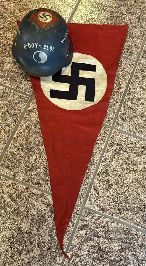 Original WWII Era German NSDAP (Nazi Party) Cloth Wall Pennant Type Flag Brought Home By A U.S. Veteran Certified. Utilized by pretty much by all the organization of the Third Reich in one form or another. The swastika, (a Sanskrit word meaning “well-being”), is an ancient symbol that was utilized in numerous diverse cultures and signified both the cycle of life and the sun. The swastika was also a Nordic rune and the pagan Germanic symbol for Thor, God of Adventurers. In good condition HIGH QUALITY DOUBLE sided 17″/35″ high quality cotton bunting style material with separate sewn white disk and HIGH QUALITY MULT-PIECE swastika. A fantastic piece of WWII history. In good condition with very minor storage wear no fading (see photos). One side has a few scuffs and marks. This flag is a high-quality version. These are a better quality that the last parade ones we had and larger with reinforced edges. Even with the minor condition issues it Overall a very collectible flag with lots of history Nice used example showing the expected age and wear. 100% Guaranteed to be authentic Brought home by a solider as a trophy of war. A very displayable size in good condition an outstanding example. Complete museum documentation (COA) Provided. Certified by The Gettysburg Museum of History. The Gettysburg Museum of History does not support or condone Adolf Hitler or the Nazi Party and is only offering this as a historic relic. Please see our other items. Also note when browsing our web site there are several pages of items, at the bottom of the list look for other page numbers. Don’t miss it!