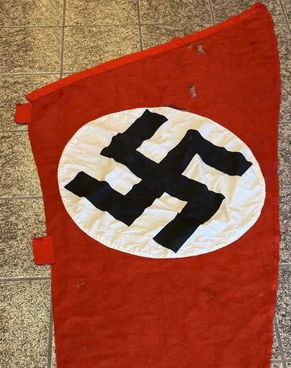 Original WWII Era German NSDAP (Nazi Party) Cloth Flag Pennant Type Flag Brought Home By A U.S. Veteran Certified. Utilized by pretty much by all the organization of the Third Reich in one form or another. The swastika, (a Sanskrit word meaning “well-being”), is an ancient symbol that was utilized in numerous diverse cultures and signified both the cycle of life and the sun. The swastika was also a Nordic rune and the pagan Germanic symbol for Thor, God of Adventurers. In good condition HIGH QUALITY DOUBLE sided 12″/49″ high quality wool bunting style material with separate sewn white disk and screened swastika. With loops for a pole. A fantastic piece of WWII history. In good condition with very minor storage wear no fading (see photos). One side has a few scuffs and marks. This flag is a high-quality version. These are a better quality that the last parade ones we had and larger with reinforced edges. Even with the minor condition issues it Overall a very collectible flag with lots of history Nice used example showing the expected age and wear. 100% Guaranteed to be authentic Brought home by a solider as a trophy of war. A very displayable size in good condition an outstanding example. Complete museum documentation (COA) Provided. Certified by The Gettysburg Museum of History. The Gettysburg Museum of History does not support or condone Adolf Hitler or the Nazi Party and is only offering this as a historic relic. Please see our other items. Also note when browsing our web site there are several pages of items, at the bottom of the list look for other page numbers. Don’t miss it! Some mothing!