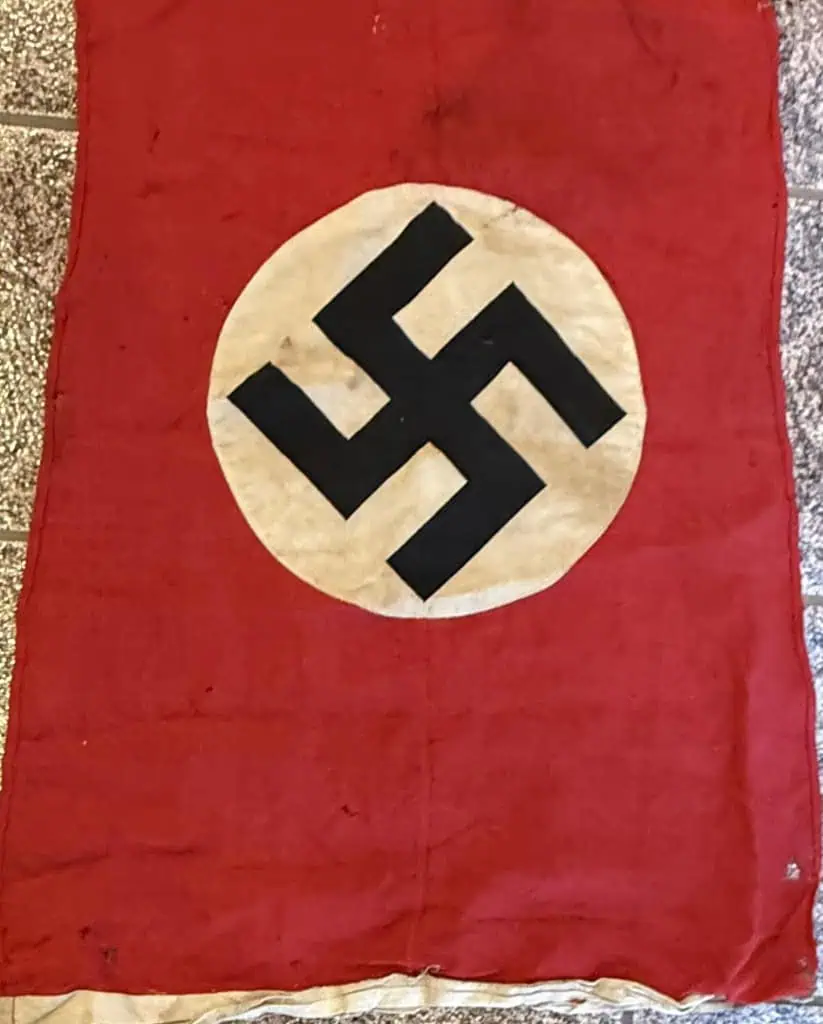 Original WWII Era German NSDAP (Nazi Party) Cloth Flag Pennant Type Flag Brought Home By A U.S. Veteran Certified. Utilized by pretty much by all the organization of the Third Reich in one form or another. The swastika, (a Sanskrit word meaning “well-being”), is an ancient symbol that was utilized in numerous diverse cultures and signified both the cycle of life and the sun. The swastika was also a Nordic rune and the pagan Germanic symbol for Thor, God of Adventurers. In good condition HIGH QUALITY DOUBLE sided 25″/152″ high quality wool bunting style material with separate sewn white disk and screened swastika. . A fantastic piece of WWII history. In good condition with very minor storage wear no fading (see photos). One side has a few scuffs and marks and a few small areas of loss. This flag is a high-quality version. Even with the minor condition issues it Overall a very collectible flag with lots of history Nice used example showing the expected age and wear. 100% Guaranteed to be authentic Brought home by a solider as a trophy of war. A very displayable size in good condition an outstanding example. Complete museum documentation (COA) Provided. Certified by The Gettysburg Museum of History. The Gettysburg Museum of History does not support or condone Adolf Hitler or the Nazi Party and is only offering this as a historic relic. Please see our other items. Also note when browsing our web site there are several pages of items, at the bottom of the list look for other page numbers. Don’t miss it! Some loss from mothing! A VERY Unusual Size!