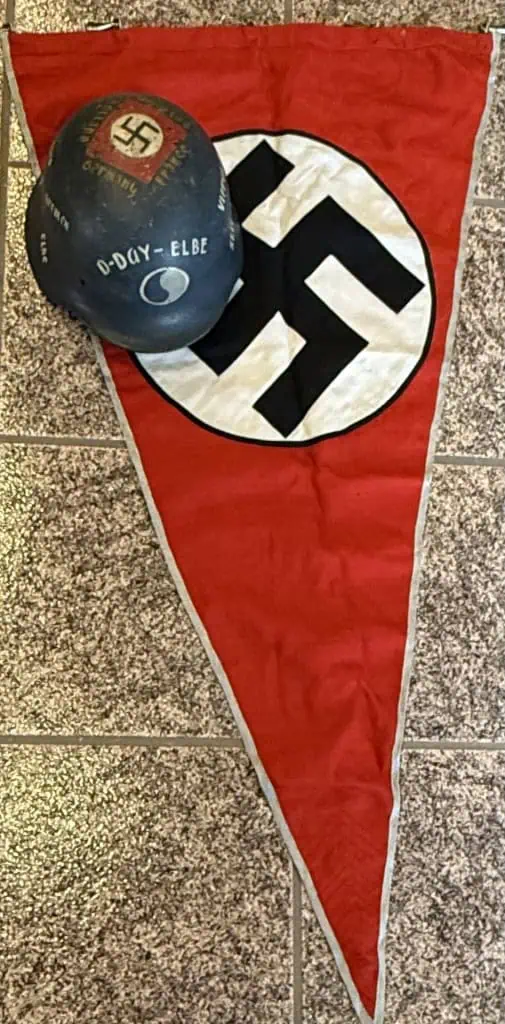 Original WWII Era German NSDAP (Nazi Party) Cloth Wall Pennant Type Flag With metal Hooks Brought Home By A U.S. Veteran Certified. Utilized by pretty much by all the organization of the Third Reich in one form or another. The swastika, (a Sanskrit word meaning “well-being”), is an ancient symbol that was utilized in numerous diverse cultures and signified both the cycle of life and the sun. The swastika was also a Nordic rune and the pagan Germanic symbol for Thor, God of Adventurers. In good condition HIGH QUALITY DOUBLE sided 18″/37″ high quality cotton bunting style material with separate sewn white disk and screened swastika. With Red White And Black Twist Rope Hanger and a metal hook. A fantastic piece of WWII history. In good condition with very minor storage wear no fading a few pin holes (see photos).. This flag is a high-quality version. These are a better quality that the last parade ones we had and larger with reinforced edges. Even with the minor condition issues it Overall a very collectible flag with lots of history Nice used example showing the expected age and wear. 100% Guaranteed to be authentic Brought home by a solider as a trophy of war. A very displayable size in good condition an outstanding example. Complete museum documentation (COA) Provided. Certified by The Gettysburg Museum of History. The Gettysburg Museum of History does not support or condone Adolf Hitler or the Nazi Party and is only offering this as a historic relic. Please see our other items. Also note when browsing our web site there are several pages of items, at the bottom of the list look for other page numbers. RARE EARLY VERY HIGH QUALITY PIECE Don’t miss it!