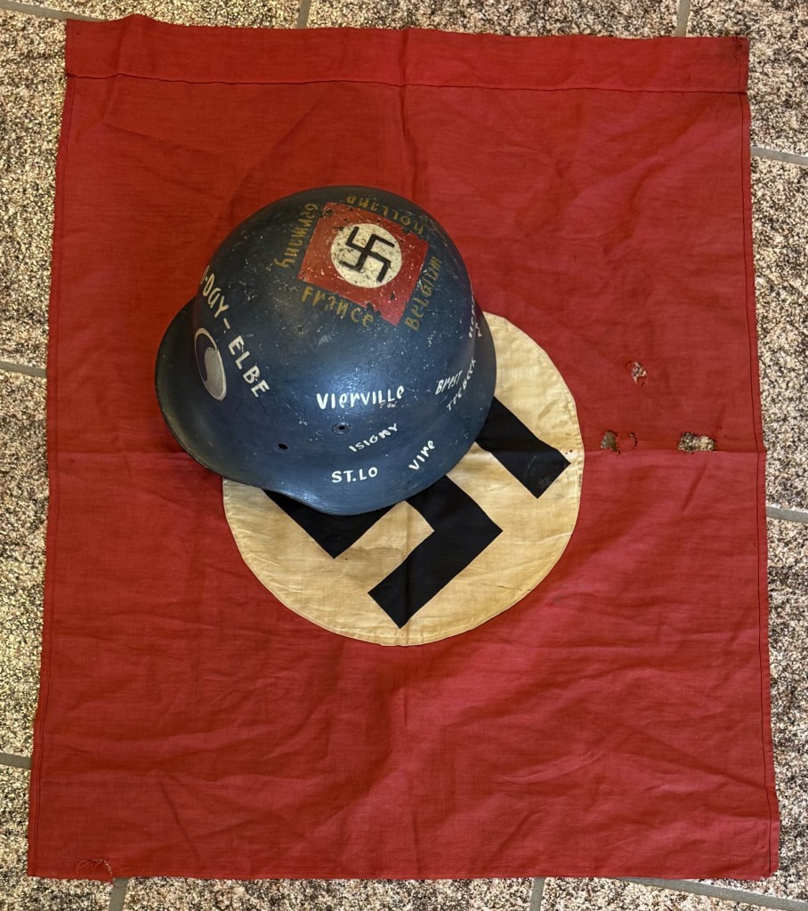 Original WWII Era German Nazi Party Flag Certified. A standard style Cloth banner type flag. Utilized by pretty much by all the organization of the Third Reich in one form or another. The swastika, (a Sanskrit word meaning “well-being”), is an ancient symbol that was utilized in numerous diverse cultures and signified both the cycle of life and the sun. The swastika was also a Nordic rune and the pagan Germanic symbol for Thor, God of Adventurers. In good condition double sided 22″/27! standard cotton bunting style material with screened swastika and disk. A fantastic piece of WWII history good used condition with storage wear, small holes (see photos) This flag is A good quality version and one of the better displayable sizes for the most discriminating and cultivated collector. Even with the minor condition issues it Overall a very collectible flag with lots of history Nice period used flag captured by a U.S. Veteran and brought home as a war trophy. Nice used example showing the expected age . 100% Guaranteed to be authentic Brought home by a solider as a trophy of war. Don’t miss this one! RARE in this size. Complete museum documentation (COA) Provided. Certified by The Gettysburg Museum of History. The Gettysburg Museum of History does not support or condone Adolf Hitler or the Nazi Party and is only offering this as a historic relic. Please see our other items. Also note when browsing our web site there are several pages of items, at the bottom of the list look for other page numbers. RARE IN THIS SIZE. Good EXAMPLE! NSDAP FLAGS ARE GETTING TOUGHER TO FIND! Don’t Miss It!!!! RARE, Good used but a used been there Condition! priced according to condition,