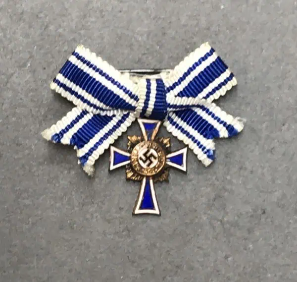 Original German Miniature Mother’s Cross Ehrenkreuz der Deutschen Mutter In bronze. The Mother’s Cross was introduced by Adolf Hitler on December 16TH 1938 as part of a large propaganda campaign aimed at increasing the birth rate. The award was officially designated, Honor Cross of the German Mother, and was instituted in three grades to recognize and reward childbearing German females. The three grades consisted of the bronze cross for bearing four or five children, the silver cross for bearing six or seven children and the gold cross for bearing eight or more children. Criteria for the award included that the parents be of pure German blood, and that the mother was worthy of such an honor. Two-piece, stamped tombac award with a bronze wash and blue and white enamel work. Award in the form of a Christian cross with outward fluted arms in semi-translucent blue enamel with white enamel border. Cross has a raised sunburst pattern emanating between its arms. Separate central circular field with white enamel base and black static swastika, encompassed by a circular border with embossed Latin script, “Der Deutschen Mutter”, (The German Mother).    Original brooch style ribbon and pin is also included. Good condition with some wear and storage age (see photos) and expected issues some loss to the ribbon.  100% Guaranteed to be authentic Complete Museum documentation (COA) Provided. Certified by The Gettysburg Museum of History.  Please see our other Mother Crosses and other items.  Also note when browsing our web site there are several pages of items, at the bottom of the list look for other page numbers.