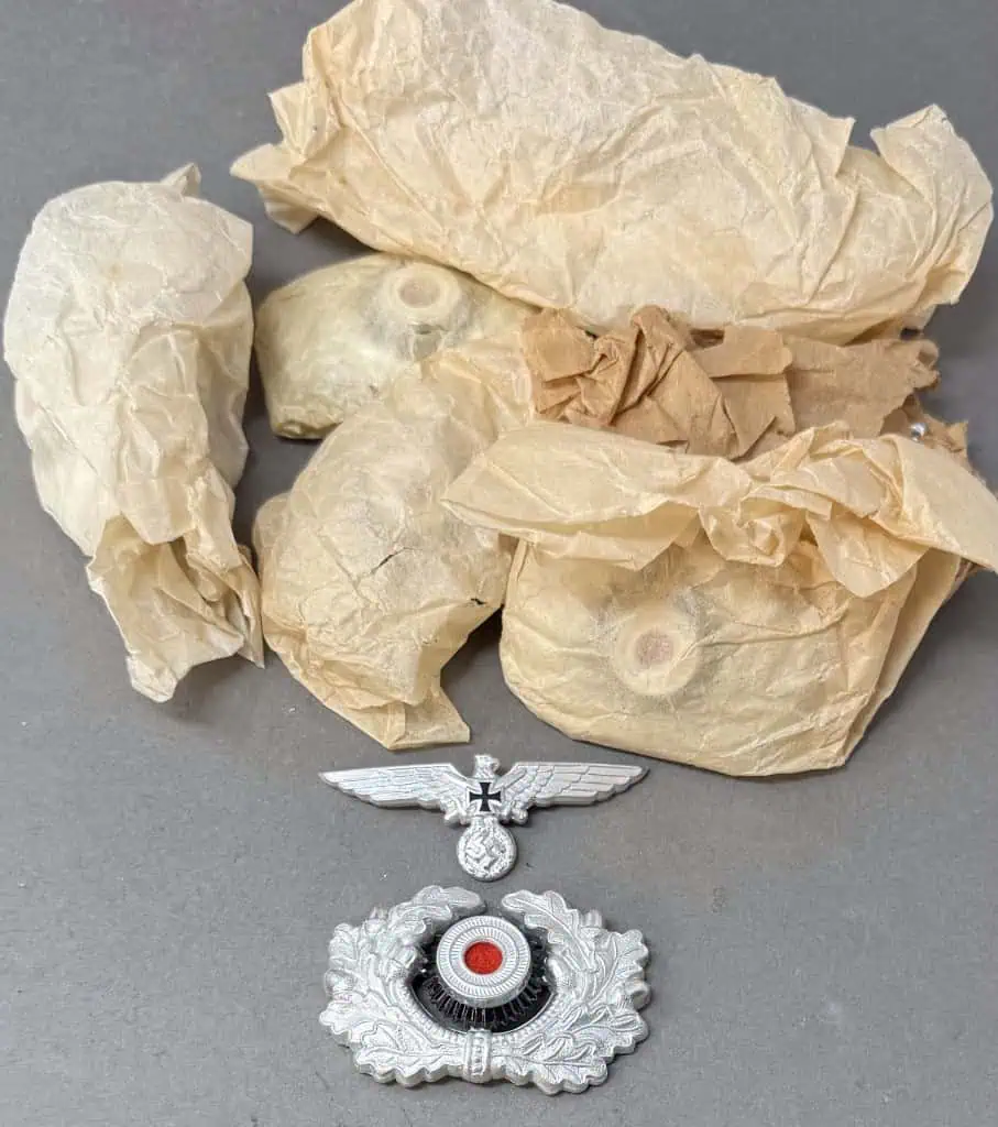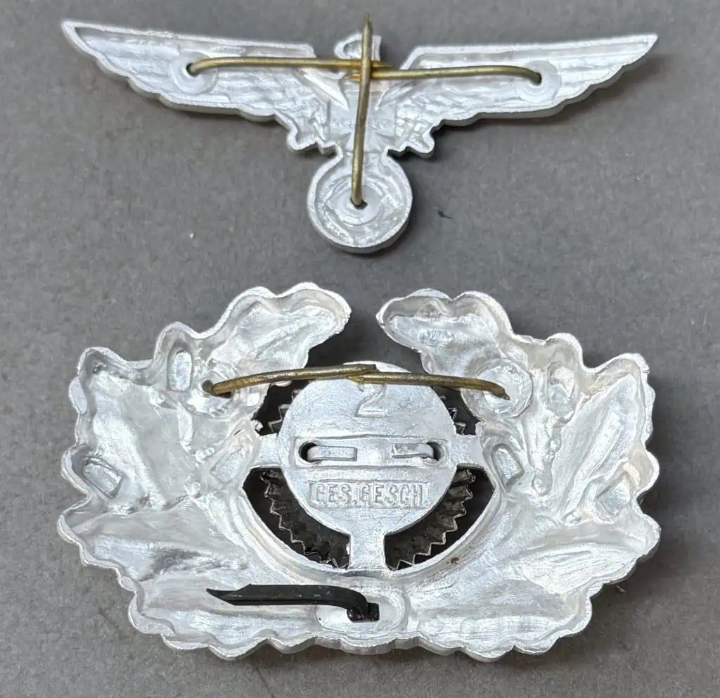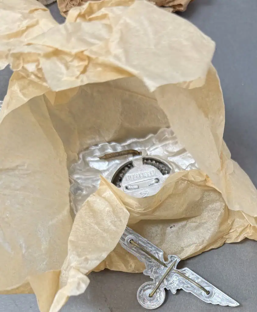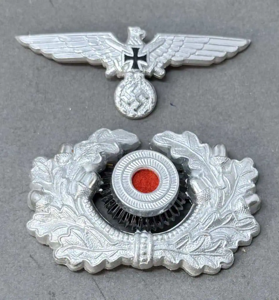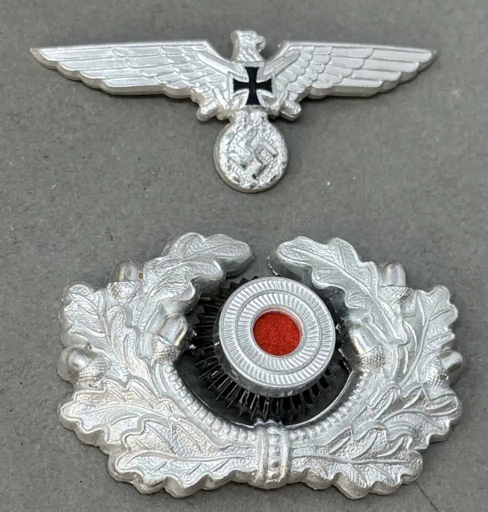 Original Near Mint WWII German NS-RKB MEMBER’S CAP EAGLE. (NS-RKB Hoheitsabzeichen) And Cockade With Original Wrapper Brought Home By A U.S. Veteran Certified. The DRKB, Deutscher Reichskriegerbund (Kyffhäuserbund), (German National Association of Veterans, Kyffhäuser Association), was formed during WWI, and was based on the DKB, Deutscher Kriegerbund (German Veterans Association), originally formed after the war of 1870-71. The addition of “Kyffhäuser” in the associations name referred to the Kyffhäuser mountain where a large war memorial had been erected. The goal of the association was to preserve the morale and comradeship of former soldiers and to financially assist its members if required. On March 29TH 1938 the DRKB was renamed NS-RKB, Nationalsozialistische-Reichskriegerbund, (National Socialist-State Soldiers League), by the NSDAP and amalgamated with most of the earlier veterans’ associations into one national organization. Uniform and headgear regulations of the DRKB/NS-RKB were introduced prior to 1933 and were modified again in 1936 and 1938. The 1938 uniform modifications introduced a new pattern national eagle for wear on the breast and the visor cap. The new eagle was almost identical to the earlier, (circa 1936), Soldatenbund, (Soldiers League), eagle but had the eagle facing to its left as opposed to the right facing Soldatenbund eagle. Injection molded aluminum construction left facing national eagle with a silver wash. The eagle features out-stretched wings and is clutching a wreathed, canted, swastika in its talons. The eagle has an Iron Cross superimposed over crossed swords on its breast. The reverse of the eagle is a mirror image of the obverse. The reverse has 3 pins for attaching to a cap that are intact The reverse is well marked with embossed numeral maker code number. Also the cockade a stamped, polished aluminum, oak-leaf wreath encompassing a three piece national tri-color cockade with a black fluted base, natural aluminum roundel, and red cloth center dot. Excellent example. In it’s original packaging paper wrapped together. Some slight storage wear and expected issues with the wrapper. 100% Guaranteed to be authentic brought home by a U.S. Solider Complete Museum documentation (COA) Provided. Certified by The Gettysburg Museum of History. The Gettysburg Museum of History does not support or condone Adolf Hitler or the Nazi Party and is only offering this as a historic relic. Please see our other items. Also note when browsing our web site there are several pages of items, at the bottom of the list look for other page numbers. NICE MINT SET! These are RARELY FOUND TOGETHER Especially rare with the original packing paper! Offer is for one set with paper package.