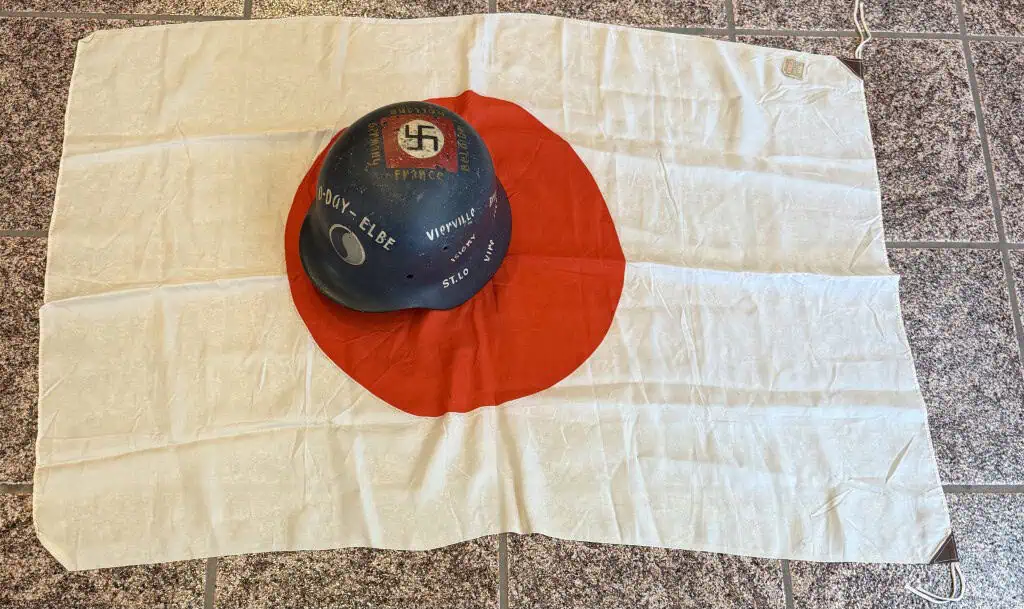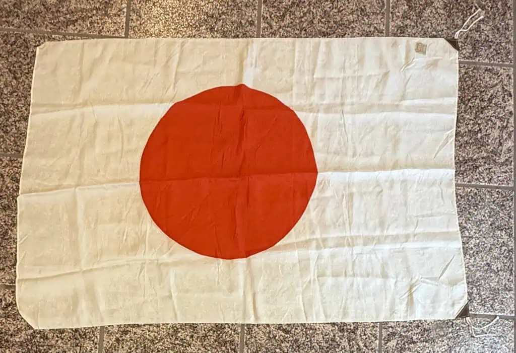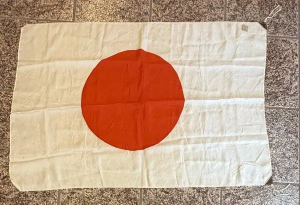 Original WWII Japanese NATIONAL FLAG WITH Paper Tag Brought Home By A U.S. Veteran Certified. Most Japanese troops during the second world war carried a personal flag. They had practical as well as patriotic uses, such as marking positions to keep them safe from friendly aircraft while advancing. One piece silk example is 22″ x 36″. An approximately 11″ diameter red “Himaru” is screened to the center of the flag’s white field.  . Shows the expected age (See photos)  .  100% Guaranteed to be authentic and is certified by The Gettysburg Museum Of History and comes with our Museum COA (certificate of authenticity). A rare piece of WWII history. DO NOT MISS THIS! good but used but almost mint  condition  nice VERY HIGH Quality silk version! With Paper tag!