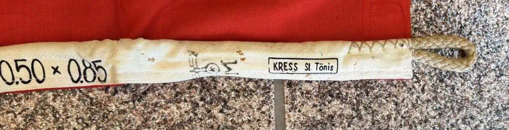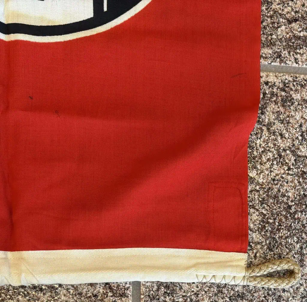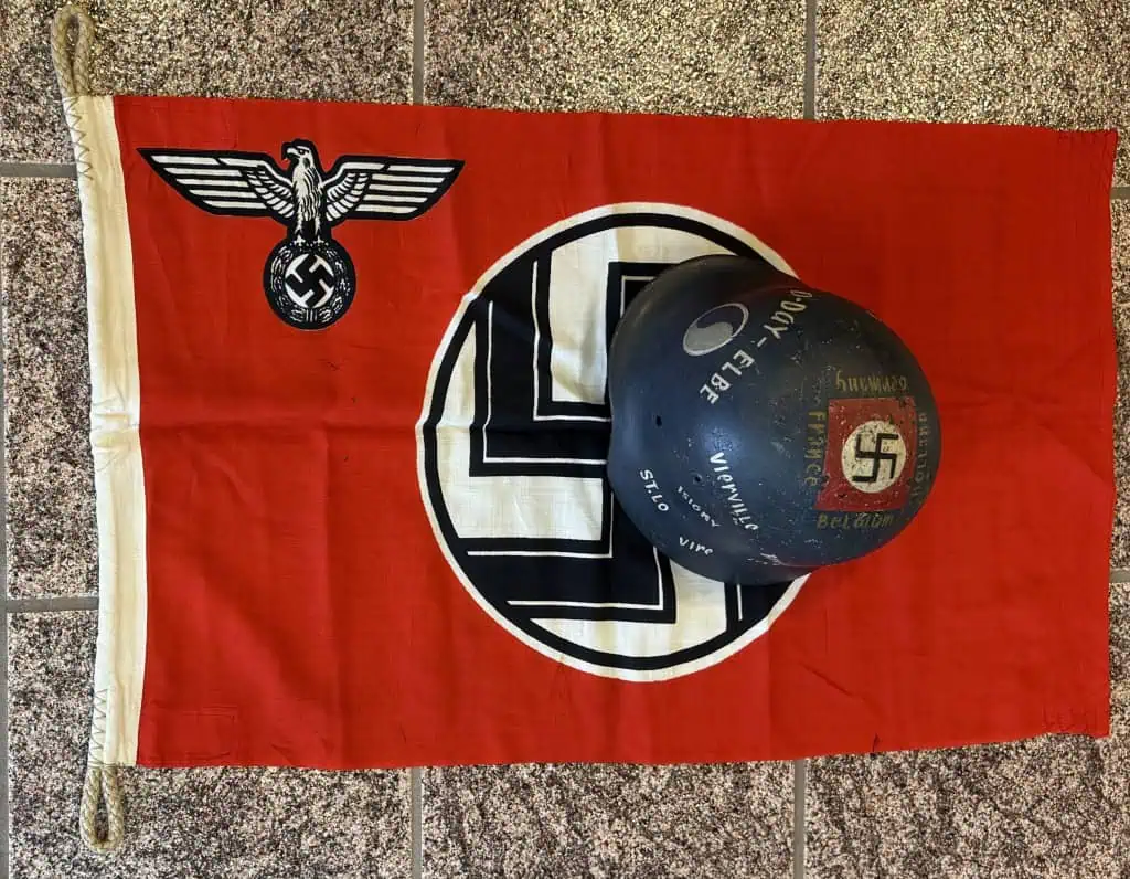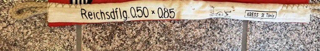 Original German NSDAP (NAZI PARTY) State Service Flag Brought Home By A U.S. Veteran Certified. A WWII German State Service flag. In good condition measures about 20″/34″ marked .50x.85″ (centimeters )we placed a helmet on it for a size reference. State Service Flags flew on all Government buildings that were not directly Military such as Post-offices, and other Government buildings. A really great display piece for your war room. A fantastic piece of history This flag is A good quality version and one of the better display sizes for the most discriminating and cultivated collector. Printed on two sides (one side is mirror image). a very collectible flag with lots of history. Nice period used flag captured by a U.S. Veteran and brought home as a war trophy. 100% Guaranteed to be authentic. In good but used condition NO fading and NO MOTHING! . The edge liner is intact (see photos). Has a few minor light storage spots otherwise near mint (see photos) Don’t miss this one! Complete museum documentation (COA) Provided. Certified by The Gettysburg Museum of History. The Gettysburg Museum of History does not support or condone Adolf Hitler or the Nazi Party and is only offering this as a historic relic. Please see our other items. Also note when browsing our web site there are several pages of items, at the bottom of the list look for other page numbers. NICE EXAMPLE!! In good but used almost mint Condition very clean! Don’t Miss This one! Very displayable size! This is one of the rarest sizes only one we have had in several years! Also has a mega rare Maker mark by KRESS St. Tönis and has a KM acceptance stamp on the white cotton border. Still has bright and vivid colors, just a really nice flag! Having a kreigs stamp on a State Service flag is really rare meaning it was used by the military on a State vehicle, boat, or building! RARE AS RARE CAN BE!