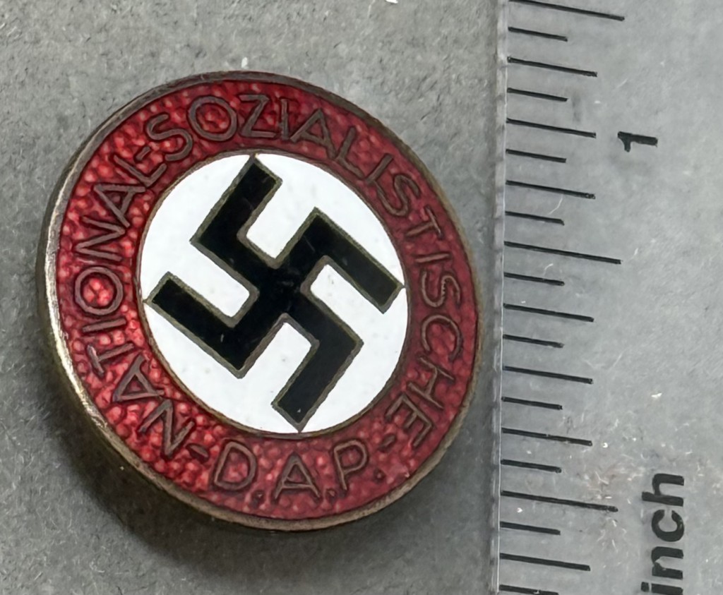 Original German NSDAP (Nazi) Party Enamel Early Membership Badge Certified By The Gettysburg Museum Of History. The NSDAP, Nationalsozialistische Deutsche Arbeiterpartei, (National Socialist German Worker’s Party), was originally founded in Munich as the DAP, Deutsche Arbeiterpartei, (German Worker’s Party), on January 5TH 1919. When Adolf Hitler joined the DAP in the autumn of 1919, he was to reform what was basically a debating society into an active political party. Appointed as the first chairman of the party on July 29TH 1921 Hitler was to restructure it along para-military lines in a hierarchy of four levels of government. Of Note: In late 1934 items manufactured for the NSKK, including membership pins, came under the quality control of the RZM, Reichzeugmeisterei, (National Equipment Quartermaster) and as a result were marked with the RZM logo when appropriate. Standard issue membership badge awarded to all personnel on acceptance as an official party member. 24mm diameter, die struck alloy badge NSDAP membership badge with multi-colored enamel work. Badge features a red, circular outer border with embossed silvered script, “National-Sozialistiche-D.A.P.”, encompassing a white enamel field with canted black enamel swastika. Has a button clasp intact. RZM marked Maker code M1/72 for maker Fritz Zimmermann, Stuttgart. In very good but used condition. Nice used example showing the expected but mild storage age and wear (see photos) 100% Guaranteed to be authentic. Complete museum documentation (COA) Provided. Certified by The Gettysburg Museum of History. The Gettysburg Museum of History does not support or condone Adolf Hitler or the Nazi Party and is only offering this as a historic relic. Please see our other items. Also note when browsing our web site there are several pages of items, at the bottom of the list look for other page numbers. Don’t Miss It! NICE EXAMPLE!