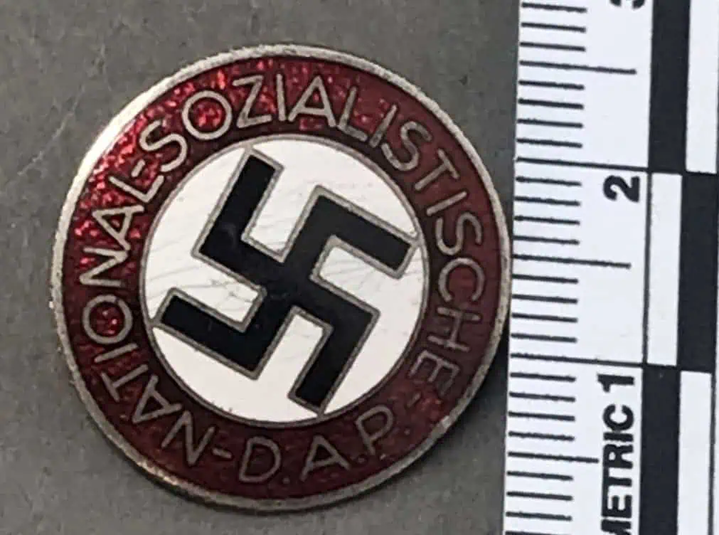 Original German NSDAP (Nazi) Party Enamel RZM Marked Membership Badge Certified By The Gettysburg Museum Of History. The NSDAP, Nationalsozialistische Deutsche Arbeiterpartei, (National Socialist German Worker’s Party), was originally founded in Munich as the DAP, Deutsche Arbeiterpartei, (German Worker’s Party), on January 5TH 1919. When Adolf Hitler joined the DAP in the autumn of 1919, he was to reform what was basically a debating society into an active political party. Appointed as the first chairman of the party on July 29TH 1921 Hitler was to restructure it along para-military lines in a hierarchy of four levels of government. Of Note: In late 1934 items manufactured for the NSKK, including membership pins, came under the quality control of the RZM, Reichzeugmeisterei, (National Equipment Quartermaster) and as a result were marked with the RZM logo when appropriate. Standard issue membership badge awarded to all personnel on acceptance as an official party member. 24mm diameter, die struck alloy badge NSDAP membership badge with multi-colored enamel work. Badge features a red, circular outer border with embossed silvered script, “National-Sozialistiche-D.A.P.”, encompassing a white enamel field with canted black enamel swastika. Has a pinback intact. RZM marked with maker code M1/100 for maker Werner Redo, Saarlautern. In very good but used condition. Nice used example showing the expected but mild storage age and wear (see photos)! 100% Guaranteed to be authentic Brought home by a U.S. solider as a trophy of war. Complete museum documentation (COA) Provided. Certified by The Gettysburg Museum of History. The Gettysburg Museum of History does not support or condone Adolf Hitler or the Nazi Party and is only offering this as a historic relic. Please see our other items. Also note when browsing our web site there are several pages of items, at the bottom of the list look for other page numbers. Don’t Miss It! NICE USED EXAMPLE!