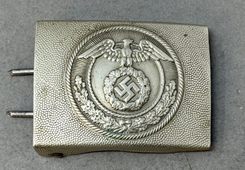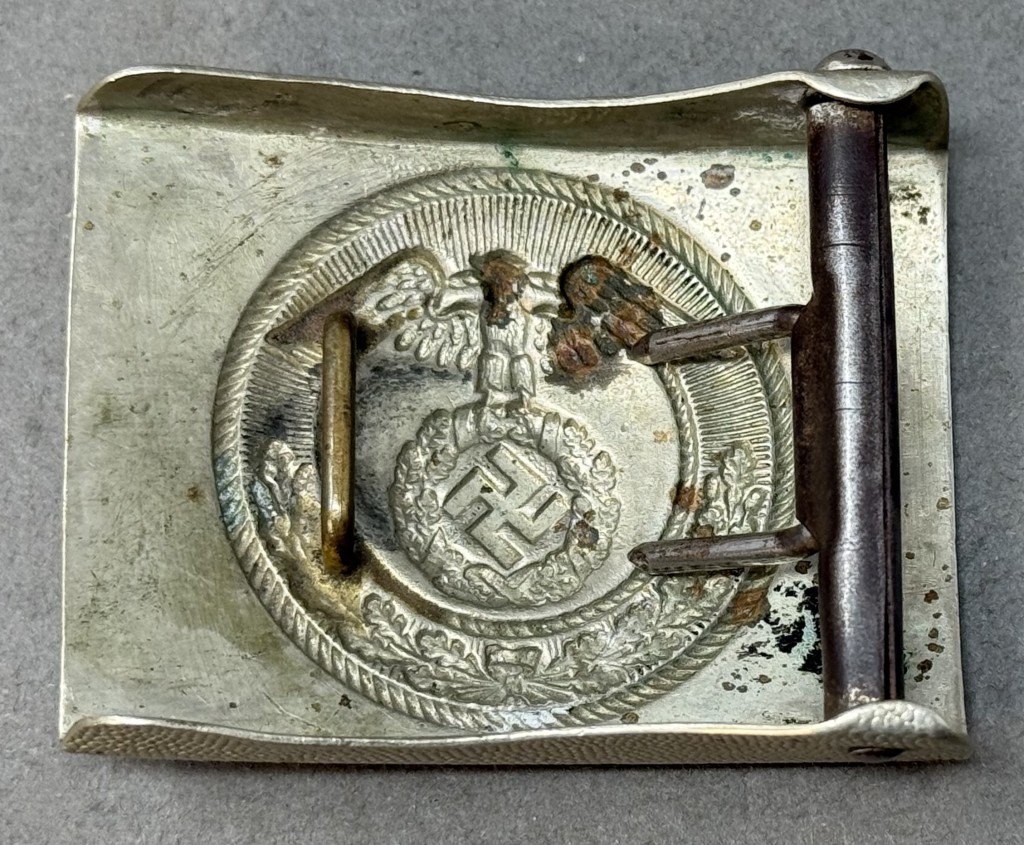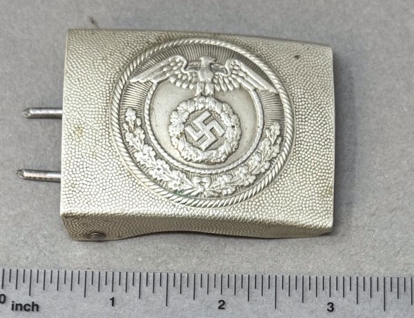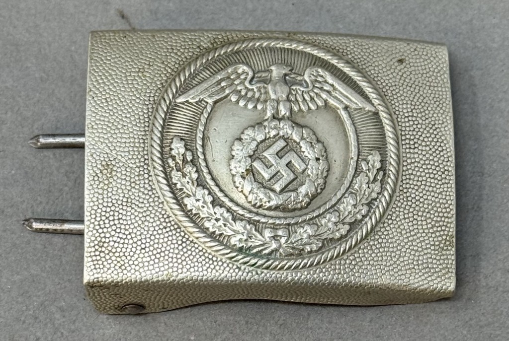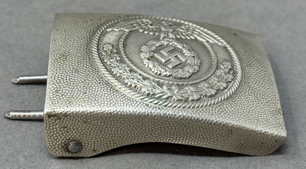 Original German NSKK EM/NCO’S BELT BUCKLE. (Koppelschloß) Scarce Nickel Plated Brought Home By A U.S. Veteran Certified. The development of the NSKK, National Sozialistisches Kraftfahr Korps, (National Socialist Motor Corps), can be traced back to 1923 when the SA introduced a Kraftfahr Abteilung, (Motor Section), to transport personnel as required. In 1928 the SA Motor section was expanded to Kraftfahrstaffeln, (Motor Squadrons). In an attempt to create a national motor corps the NSAK, National Sozialistisches Automobil Korps, (National Socialist Automobile Corps), was formed in April 1930 as a NSDAP auxiliary organization subordinate to the SA. In early 1931 Adolf Hühnlein was appointed as Chief of the NSAK and proposed a name change to NSKK, which was officially accepted in April 1931. Before the introduction of a standardized belt buckle the NSKK used the SA pattern rectangular buckle in a variety of styles usually nickel or chrome-plated over brass or steel. The 50mm x 65mm, slightly convex, stamped alloy, nickel plated, one-piece construction buckle features, to its obverse, a plain field upon which is an embossed, political-style national eagle clutching the laurel surround to a mobile swastika on a slightly domed, plain field. The eagle’s head falls on the inside of a ribbed border with simulated twisted rope trim to its inner and outer edges. The ribbed border, which is 40mm in outside diameter, has a spray of oak leaves to its base, with the eagle’s wings extending into it at the top. To the reverse is its raised buckle catch, and a prong bar with dual prongs, for the belt’s retaining tongue. . In good but used condition with no issues to Nickle Silver. Gettysburg Museum Certified (COA) provided. Rare 100% Guaranteed to be authentic. Sold for historic purposes only. See our other pieces on our web site. Also note when browsing our web site there are several pages of items, at the bottom of the list look for other page numbers. Excellent Rare OUTSTANDING EXAMPLE! RARE SOLID VERSION WITH PEBBLED TEXTURE!