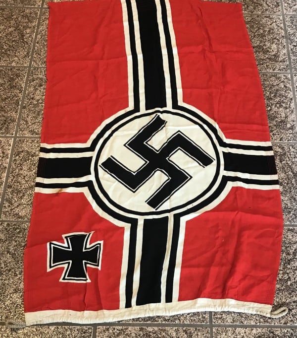 Original WWII German NSDAP (NAZI) NATIONAL WAR FLAG. (Reichskriegsflagge) Brought Home By A U.S. Veteran Certified. The national war flag was flown on all Kriegsmarine, (Navy), warships, Luftwaffe, (Air Force), airfields and all buildings owned by the Wehrmacht, (Armed Forces). The flag was also to be hoisted daily at all occupied barracks and was also utilized at victory parades and special events along with the standard national swastika flag. This example is the second pattern War Flag, circa 1937/38-1945. single piece, dual sided, printed wool/linen construction national war flag. The flag features a red base field with a central white/black/white/black bordered white disk with a black and white bordered black canted swastika to the center. The flag has black, vertical and horizontal bars emanating from the central disk with white/black/white borders. The canton features a white/black/white bordered black Iron Cross. The hoist edge has a small, dual-ply, reinforcement panel to each edge. The hoist edge is trimmed in white, tunnel looped, cotton/wool blend bunting!  Nicely maker marked!, size 80/135 (centimeters) (32″/53″) nicely maker marked with a VERY RARE MAKER!  Nice very clean example, A few small scuffs and spots  (see photos). We placed a helmet on the flag for size reference.  A fantastic piece of   history.  This flag is a good quality version and one of the better display sizes for the most discriminating and cultivated collector. a very collectible flag with lots of history. Nice period used flag captured by a U.S. Veteran   and brought home as a war trophy. 100% Guaranteed to be authentic Brought home by a solider as a trophy of war. A very desirable displayable size. Don’t miss this one!   RARE in this size. Complete museum documentation (COA) Provided. Certified by The Gettysburg Museum of History. The Gettysburg Museum of History does not support or condone Adolf Hitler or the Nazi Party and is only offering this as a historic relic. Please see our other items.  Also note when browsing our web site there are several pages of items, at the bottom of the list look for other page numbers.  Don’t miss it! Good EXAMPLES Of  KREIGS FLAGS ARE GETTING TOUGHER TO FIND!!!! In Very Nice Condition! (see photos)  And A Very RARE  maker!  Don’t Miss This one! BEST DISPLAY SIZE! Good used condition (see photos) Don’t MISS THIS!