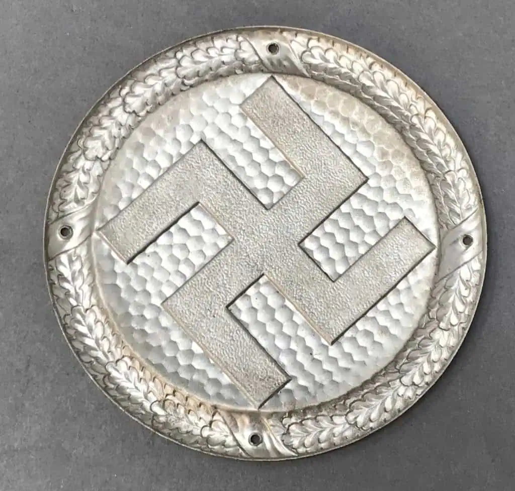 ORIGINAL OUTSTANDING RARE GERMAN NSDAP (NAZI PARTY) Swastika Wall Hanging Certified High quality silver wash alloy. Wreath and a swastika with 4 wall attachment holes it is very high-quality silver metal with black painted swastika. About 4″ round, it makes a stunning display and is real statement piece! Nice used example showing the expected age and wear (a few small insignificant storage wear scuffs otherwise excellent condition! Outstanding example, A RARE VERY! Complete museum documentation (COA) Provided. Certified by The Gettysburg Museum of History. The Gettysburg Museum of History does not support or condone Adolf Hitler or the Nazi Party and is only offering this as a historic relic. Please see our other items. Also note when browsing our web site there are several pages of items, at the bottom of the list look for other page numbers. VERY RARE! Don’t miss it!
