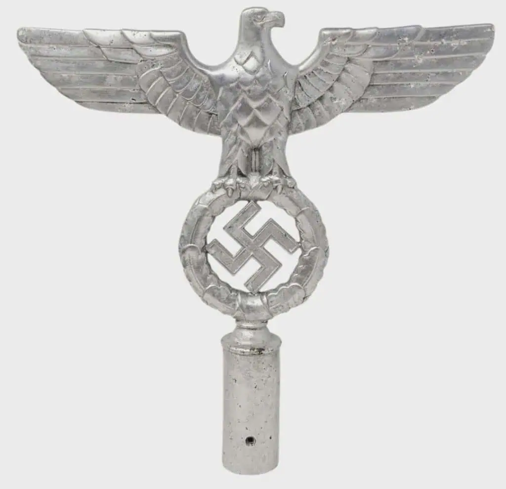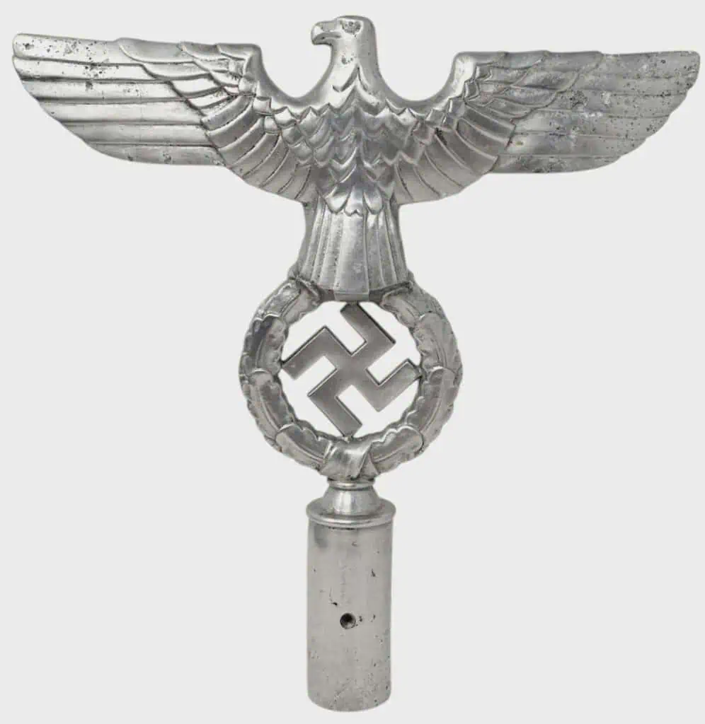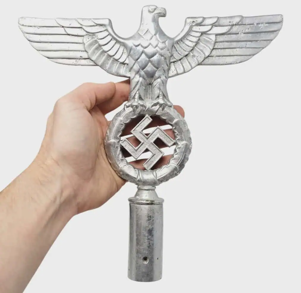 ORIGINAL OUTSTANDING RARE GERMAN NSDAP Pole Top Eagle Brought Home By A U.S. Veteran Certified. Solid aluminum, weighing 442 grams, obverse illustrating a right-facing spread-winged eagle, the eagle slightly arched forward, its talons enabling it to stand upon a wreath of oak leaves encompassing a black enameled swastika, the insignia supported upon a tubular base, die hole on the bottom of the base, reverse showing the back of the eagle and wreath, , 242 mm wide x 215 mm in height, intact enamels, light contact and surface wear, better than very fine. It remains in excellent condition. Some paint loss RZM marked. Outstanding example, A RARE FLAGPOLE TOPPER! Brought Home by a U.S. Veteran. 100% Guaranteed to be Authentic. Complete museum documentation (COA) Provided. Certified by The Gettysburg Museum of History. The Gettysburg Museum of History does not support or condone Adolf Hitler or the Nazi Party and is only offering this as a historic relic. Please see our other items. Also note when browsing our web site there are several pages of items, at the bottom of the list look for other page numbers. VERY RARE! Don’t miss it! EXCELLENT CONDITION!