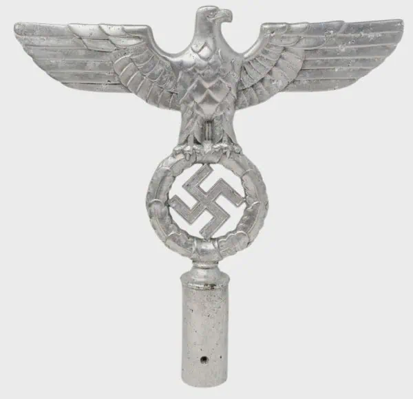 ORIGINAL OUTSTANDING RARE GERMAN NSDAP Pole Top Eagle Brought Home By A U.S. Veteran Certified. Solid aluminum, weighing 442 grams, obverse illustrating a right-facing spread-winged eagle, the eagle slightly arched forward, its talons enabling it to stand upon a wreath of oak leaves encompassing a black enameled swastika, the insignia supported upon a tubular base, die hole on the bottom of the base, reverse showing the back of the eagle and wreath, , 242 mm wide x 215 mm in height, intact enamels, light contact and surface wear, better than very fine. It remains in excellent condition. Some paint loss RZM marked. Outstanding example, A RARE FLAGPOLE TOPPER! Brought Home by a U.S. Veteran. 100% Guaranteed to be Authentic. Complete museum documentation (COA) Provided. Certified by The Gettysburg Museum of History. The Gettysburg Museum of History does not support or condone Adolf Hitler or the Nazi Party and is only offering this as a historic relic. Please see our other items. Also note when browsing our web site there are several pages of items, at the bottom of the list look for other page numbers. VERY RARE! Don’t miss it! EXCELLENT CONDITION!