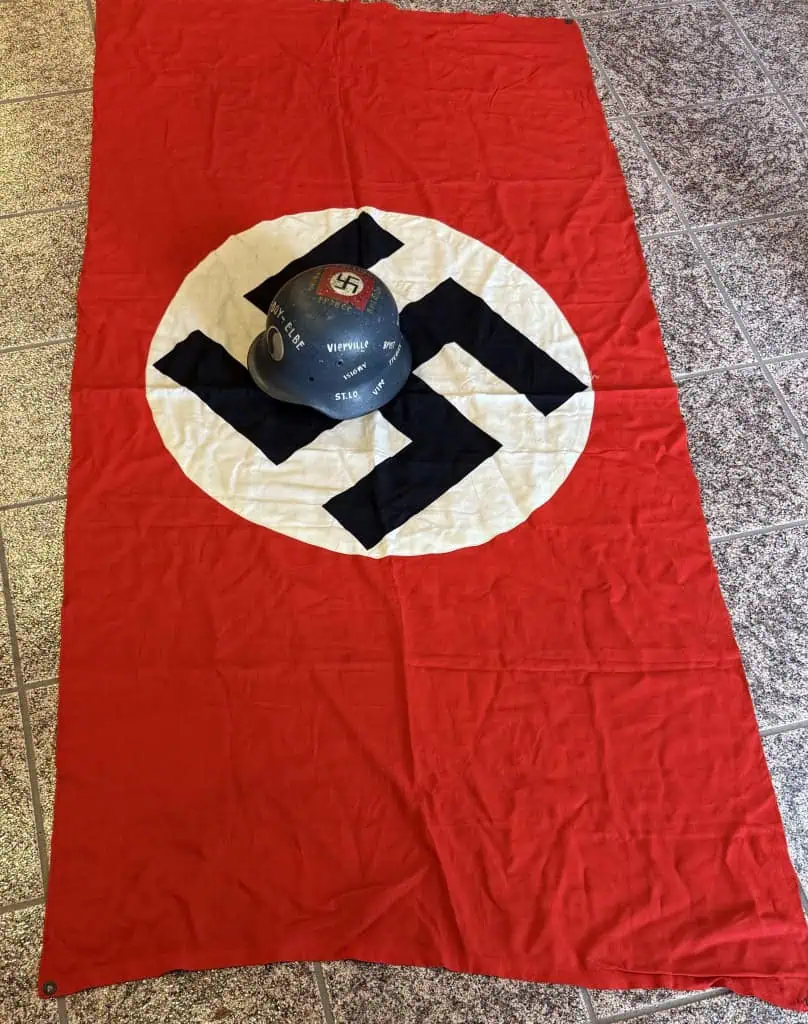 HIGH QUALITY Original WWII Era German Nazi Party Vehicle Identification Flag Certified. A standard style large Cloth flag. Utilized by pretty much by all the organization of the Third Reich in one form or another. The swastika, (a Sanskrit word meaning “well-being”), is an ancient symbol that was utilized in numerous diverse cultures and signified both the cycle of life and the sun. The swastika was also a Nordic rune and the pagan Germanic symbol for Thor, God of Adventurers. In good condition single sided 37″/77”! standard cotton bunting style material with separate sewn white disk and screened swastika. We placed a helmet on the flag for size reference. A fantastic piece of WWII history. Has the FOUR original metal grommets (ONE IS MISSING) for attaching to a tank or vehicle. In good condition This flag is A good quality version and one of the better sizes for the most discriminating and cultivated collector. A very collectible flag with lots of history. Nice used example showing none of the expected age and wear (see photos) . 100% Guaranteed to be authentic Brought home by a solider as a trophy of war. A very desirable size. Don’t miss this one! RARE in this size. Complete museum documentation (COA) Provided. Certified by The Gettysburg Museum of History. The Gettysburg Museum of History does not support or condone Adolf Hitler or the Nazi Party and is only offering this as a historic relic. Please see our other items. Also note when browsing our web site there are several pages of items, at the bottom of the list look for other page numbers. RARE IN THIS SIZE. OUTSTANDING EXAMPLE! NSDAP FLAGS ARE GETTING TOUGHER TO FIND! Vehicle flags are desirable because they are true combat used flags and vehicle flags are RARE (see photos)