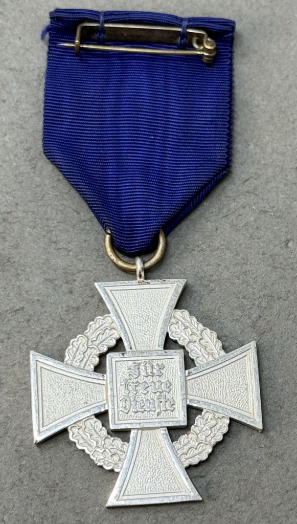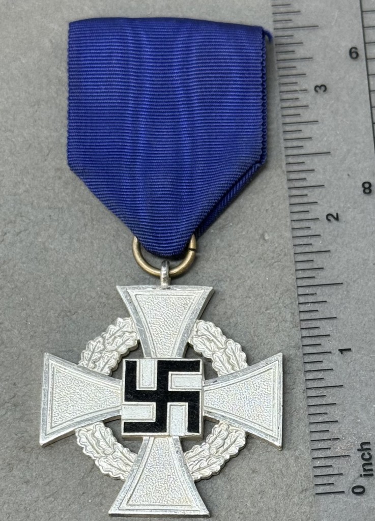 Original WWII German 25 Year FAITHFUL SERVICE Medal Certified. On January 30th, 1938, Hitler instituted the Faithful Service Decoration, in three classes, to recognize long-serving civil servants and public works personnel. The decorations were intended to be an incentive for the civilian population to foster workplace loyalty and create a stable civil service. A second class, die struck alloy decoration with silver wash  plated highlights, a frosted silver finish and a black enamel swastika. The decoration is in the form of a cross Pattée with a circular oak-leaf wreath extending between the arms of the cross. The center of the cross has a square plate with a black enameled static swastika to the obverse, and the embossed Gothic script to the reverse, “Für treue Dienste” (For Loyal Service). The arms of the cross have a slightly textured background field with a smooth, dual stepped, raised outer edge. Complete with original ribbon. Typical age toning and some storage wear  WITH ALMOST ALL OF IT’S SILVER WASH AND THE PIN STILL ATTACHED TO THE BACK. We have several and will pick the best one for you all are  A very nice example. Gettysburg Museum Certified (COA) provided. Rare 100% Guaranteed to be authentic. Sold for historic purposes only. See our other pieces on our web site.  Also note when browsing our web site there are several pages of items, at the bottom of the list look for other page numbers. NICE EXAMPLE!