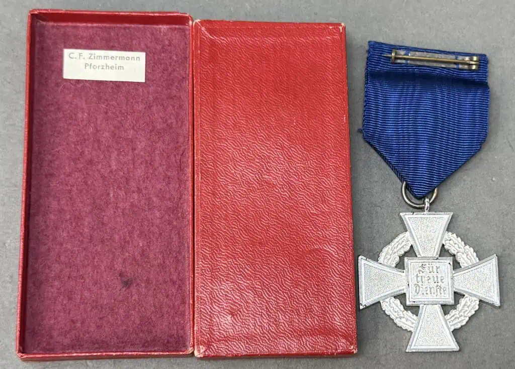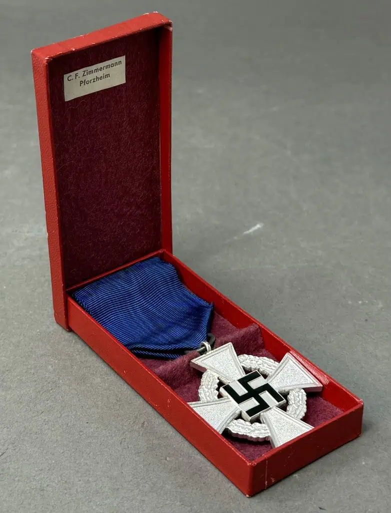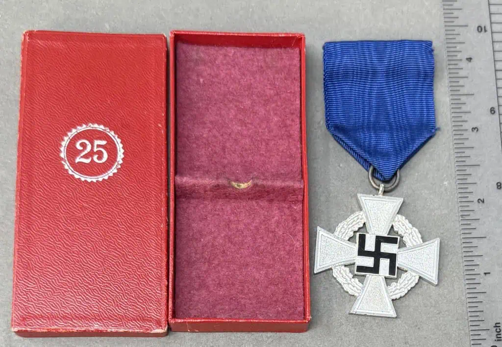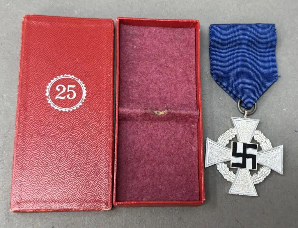 Original WWII German 25 Year FAITHFUL SERVICE Medal Certified. On January 30th, 1938, Hitler instituted the Faithful Service Decoration, in three classes, to recognize long-serving civil servants and public works personnel. The decorations were intended to be an incentive for the civilian population to foster workplace loyalty and create a stable civil service. A , die struck alloy decoration with silver wash plated highlights, a frosted silver finish and a black enamel swastika. The decoration is in the form of a cross Pattée with a circular oak-leaf wreath extending between the arms of the cross. The center of the cross has a square plate with a black enameled static swastika to the obverse, and the embossed Gothic script to the reverse, “Für treue Dienste” (For Loyal Service). The arms of the cross have a slightly textured background field with a smooth, dual stepped, raised outer edge. Complete with original ribbon with complete pin. some storage wear to the box (see photos) . The award is housed in a red simulated leather cardboard case, with a “25” encompassed by a cogged wheel embossed in silver to its top. The red felt interior has a slotted retaining cross bar to its base to hold the award in place. a very nice example some slight wear on the box. The medal is good condition with only slight storage wear on the the box and medal. Gettysburg Museum Certified (COA) provided. Rare 100% Guaranteed to be authentic. Sold for historic purposes only. See our other pieces on our web site. Also note when browsing our web site there are several pages of items, at the bottom of the list look for other page numbers. Scarce with box! See Photos otherwise almost mint OUTSTANDING EXAMPLE!