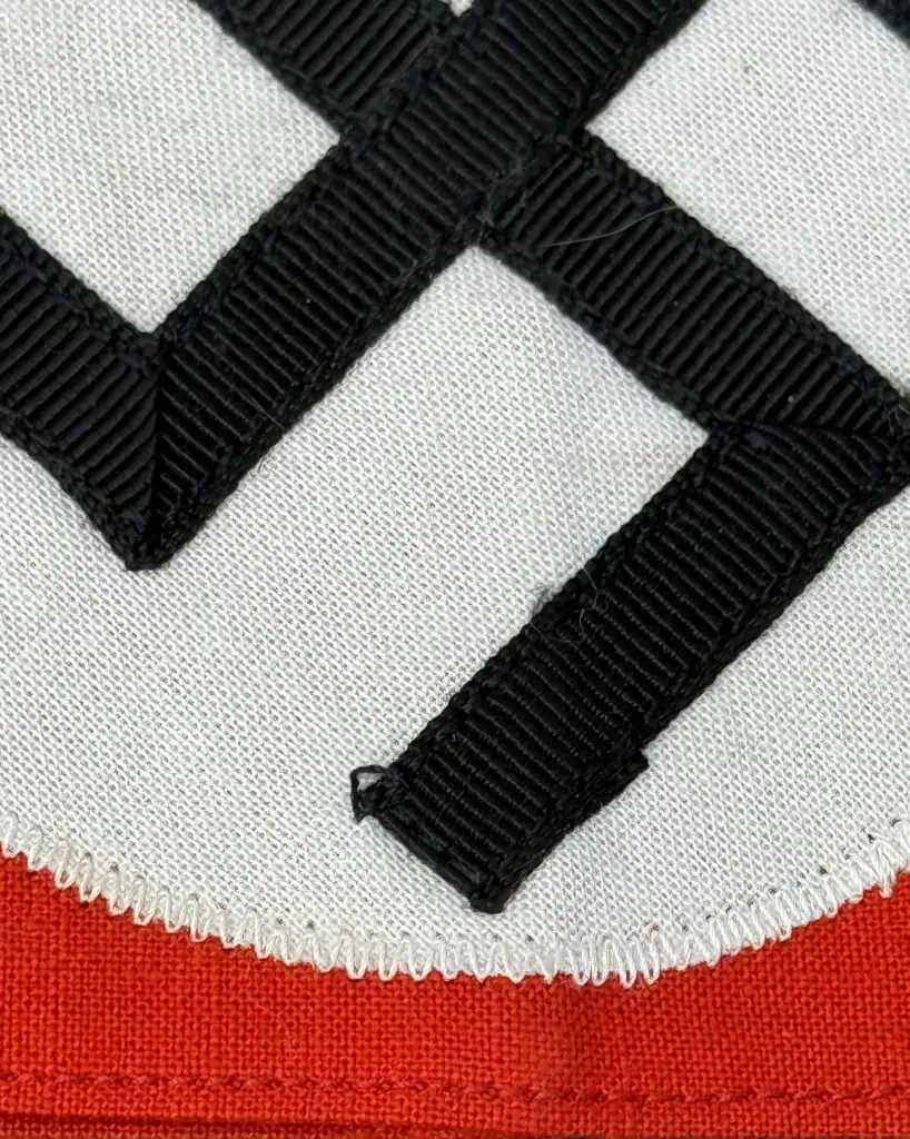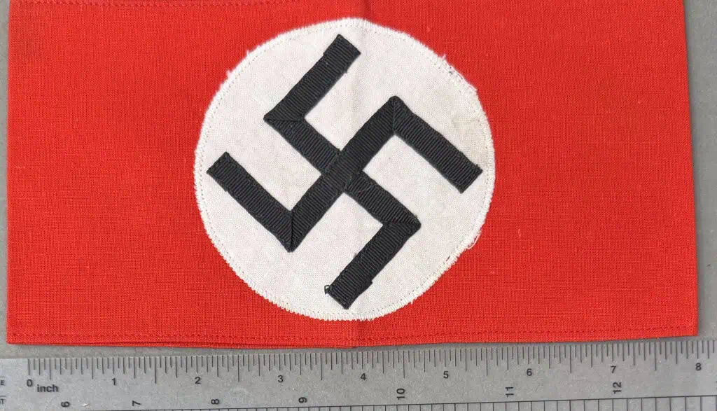 Original WWII Nazi German Multi-piece Construction Armband Brought Home By A U.S. Veteran. A U.S. vet bring back in good used condition. Some light wear from storage.  Deluxe version of the Nazi Arm Band.  The most recognizable pieces of insignia associated with the Nazi regime is the swastika armband. Utilized by pretty much by all the organization of the Third Reich in one form or another. The swastika, (a Sanskrit word meaning “well-being”), is an ancient symbol that was utilized in numerous diverse cultures and signified both the cycle of life and the sun. The swastika was also a Nordic rune and the pagan Germanic symbol for Thor, God of Adventurers.   A high-quality cotton cloth materiel. approximately 9cm diameter separate piece sewn white disk, and super high-quality multi-piece rayon swastika (SEE PHOTOS) A nice quality example. A very good earlier example. Gettysburg Museum Certified (COA) provided. Rare 100% Guaranteed to be authentic. Brought home by a U.S Veteran as a trophy of war. Sold for historic purposes only. See our other pieces on our web site.  Also note when browsing our web site there are several pages of items, at the bottom of the list look for other page numbers. You wanted the best this is it. Do not miss this one!  Armbands and are in HIGH DEMAND! Don’t Miss it!  NICE Used EXAMPLE