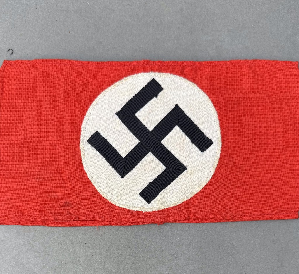Original WWII Nazi German Multi-piece Construction Armband With RZM Tag Brought Home By A U.S. Veteran. A U.S. vet bring back in good used condition. Some light wear from storage and use. Deluxe version of the Nazi Arm Band. The most recognizable pieces of insignia associated with the Nazi regime is the swastika armband. Utilized by pretty much by all the organization of the Third Reich in one form or another. The swastika, (a Sanskrit word meaning “well-being”), is an ancient symbol that was utilized in numerous diverse cultures and signified both the cycle of life and the sun. The swastika was also a Nordic rune and the pagan Germanic symbol for Thor, God of Adventurers. A high-quality cotton cloth materiel. approximately 9cm diameter separate piece sewn white disk, and high-quality multi-piece swastika. (See photos). Still has the original paper RZM tag! (SEE PHOTOS) A nice quality example. A very good earlier example. Gettysburg Museum Certified (COA) provided. Rare 100% Guaranteed to be authentic. Brought home by a U.S Veteran as a trophy of war. Sold for historic purposes only. See our other pieces on our web site. Also note when browsing our web site there are several pages of items, at the bottom of the list look for other page numbers. Do not miss this one! NICE EXAMPLE! Armbands and are in HIGH DEMAND! Don’t Miss it! Scarce with the RZM tag attached to the armband. Clean almost mint example with slight storage wear.