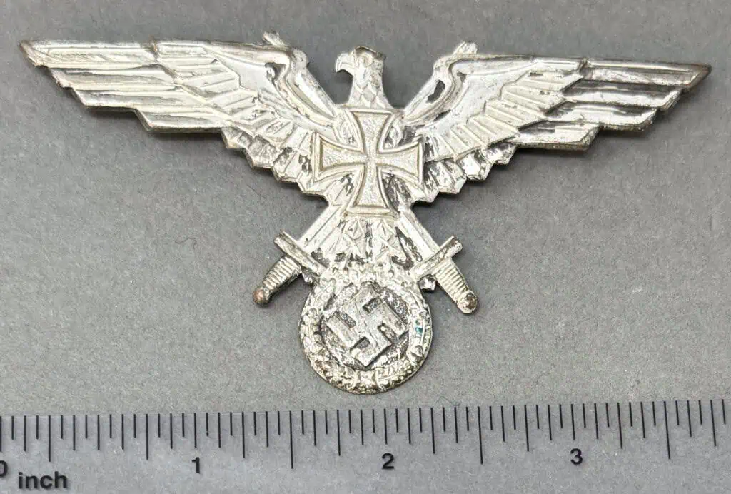 Original RARE German NSDAP (Nazi Party) NSDMB MEMBER’S BREAST EAGLE. (Hoheitsabzeichen) Certified. The NSDMB, “National Sozialistische Deutscher Marine Bund” (National Socialist German Navy League), was the new name, adopted by its members in 1935, for the earlier “Bund Deutscher Marine Vereine” (League [of the] German Navy Association). In 1938 it was attached to the NS-RKB, “Nationalsozialistische-Reichskriegerbund,” who introduced a new pattern national eagle for wear on the breast and visor cap, which was almost identical to the earlier “Soldatenbund” (Soldiers’-league) eagle. The NSDMB came under the control of the “Kriegsmarine” (Navy) in 1943. A stamped, gilt-washed alloy eagle, whose spread wings have a span of 95mm, with a wreathed, mobile swastika in its talons, and a black enamel-painted Iron Cross to its breast, behind which is an anchor and crossed swords. A horizontal pin-back device, with a hinge and catch, is to its hollow-backed reverse. “Ges.” is embossed to the reverse of one of the eagle’s wings, and “Gesch.,” to the other, for “Gesetzlich Geschützt” (By-law Protected).. Scarce. Excellent example. Some wear and expected issues. 100% Guaranteed to be authentic Complete museum documentation (COA) Provided. Certified by The Gettysburg Museum of History. The Gettysburg Museum of History does not support or condone Adolf Hitler or the Nazi Party and is only offering this as a historic relic. Please see our other items. Also note when browsing our web site there are several pages of items, at the bottom of the list look for other page numbers. NICE BIG EAGLE! RARE!