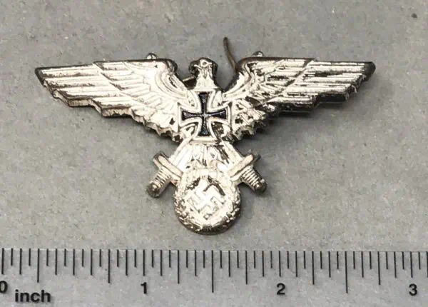 Original RARE German NSDAP (Nazi Party) NSDMB MEMBER’S CAP EAGLE. (Hoheitsabzeichen) Certified. The NSDMB, “National Sozialistische Deutscher Marine Bund” (National Socialist German Navy League), was the new name, adopted by its members in 1935, for the earlier “Bund Deutscher Marine Vereine” (League [of the] German Navy Association). In 1938 it was attached to the NS-RKB, “Nationalsozialistische-Reichskriegerbund,” who introduced a new pattern national eagle for wear on the breast and visor cap, which was almost identical to the earlier “Soldatenbund” (Soldiers’-league) eagle. The NSDMB came under the control of the “Kriegsmarine” (Navy) in 1943. A stamped, gilt-washed alloy eagle, whose spread wings have a span of 95mm, with a wreathed, mobile swastika in its talons, and a black enamel-painted Iron Cross to its breast, behind which is an anchor and crossed swords. A horizontal pin-back device is complete is to its hollow-backed reverse. . Scarce. Excellent example. Some wear and expected issues. 100% Guaranteed to be authentic Complete Museum documentation (COA) Provided. Certified by The Gettysburg Museum of History. The Gettysburg Museum of History does not support or condone Adolf Hitler or the Nazi Party and is only offering this as a historic relic. Please see our other items. Also note when browsing our web site there are several pages of items, at the bottom of the list look for other page numbers. NICE EAGLE! RARE!