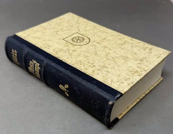 Original RARE GERMAN RARE 1940 WEDDING EDITION OF ADOLF HITLERS “MEIN KAMPF” Certified. Adolf Hitler’s autobiography and political manifest. The copy that is offered for sale was published in 1940 by Central Publishing House of the NSDAP, Franz Eher, Nachf. in Munich, Germany. In 1935, the Eher publishing house presented Hitler with the idea of giving a specially printed edition of Mein Kampf to every newly wed couple on the day of their wedding. This edition was published with a leather spine and would contain an extra presentation page in the front with blanks for the names of bride and groom and the signature of the mayor of the city, town or village.  The book is in very nice condition.!  the binding is tight and all pages are intact. The standard editions of Mein Kampf were published in the same size as a standard German bible. The reason for that was that Hitler hoped that his book would eventually replace the bible in German households! Hitler dictated this book to his secretary, Rudolf Hess while imprisoned in Landsberg after the failed 1923 revolution. The first editions, published in 1925 (Band I or Volume One) and 1926 (Band II or Volume Two) were published in separate volumes. With only a few exceptions (special editions) all subsequent Third Reich editions (1933 to 1945) contained both volumes combined in one book. Very few copies of the first editions have survived. When his book first came out it was not a success, few people cared about the book in 1925 which would almost have had a much longer title. The original title Hitler chose was “Viereinhalb Jahre [des Kampfes] gegen Lüge, Dummheit und Feigheit” (Four and a Half Years [of Struggle] against Lies, Stupidity and Cowardice). His Nazi publisher, Max Amann, decided this title was too complicated and had it shortened to Mein Kampf (simply “My Struggle”). Before Hitler became Reichs Chancellor of Germany in 1933, Mein Kampf sold very slowly; but in 1933 alone 1.5 million copies were sold. Some storage wear and typical age wear. 100% guaranteed to be authentic complete museum documentation (COA) provided. An amazing historical artifact from the 20th century’s most infamous person.  See our other AH pieces too. Also note when browsing our web site there are several pages of items, at the bottom of the list look for other page numbers! DO NOT MISS THIS! Has an inscription on the first page from the Burgermeister! EXCELLANT CONDITION!