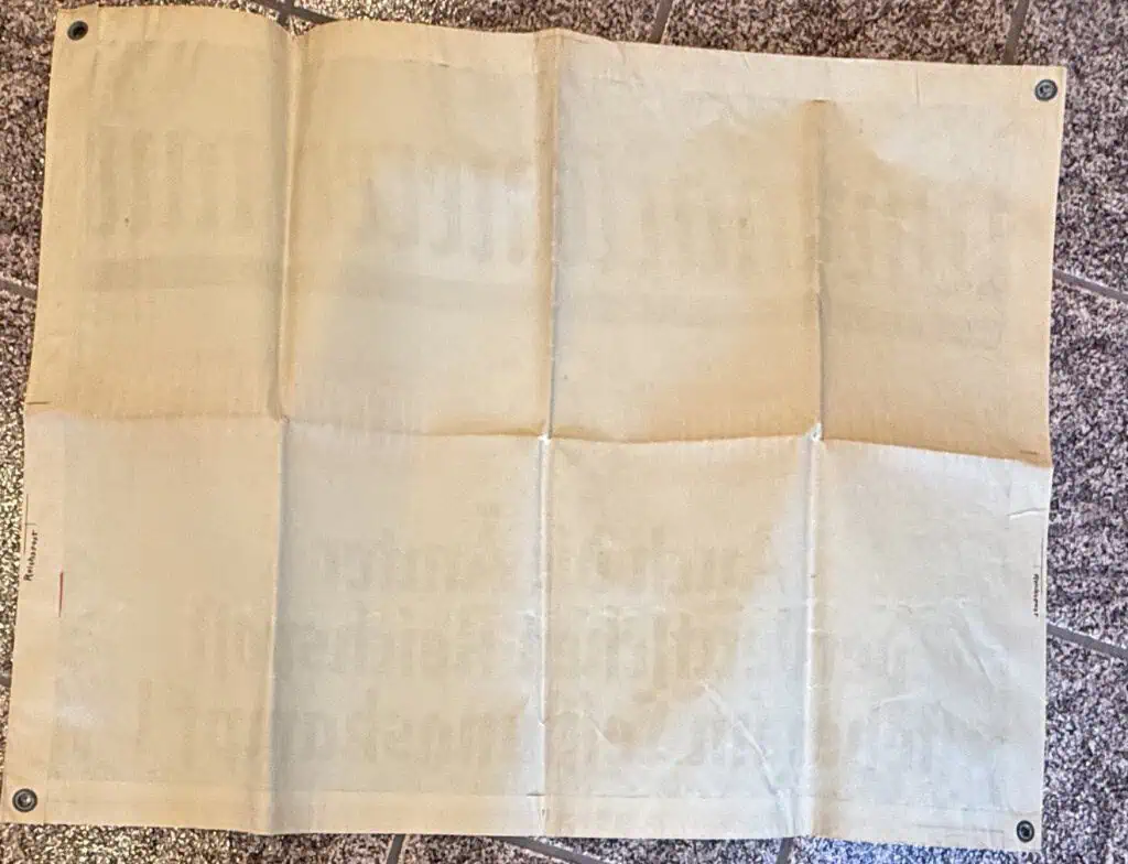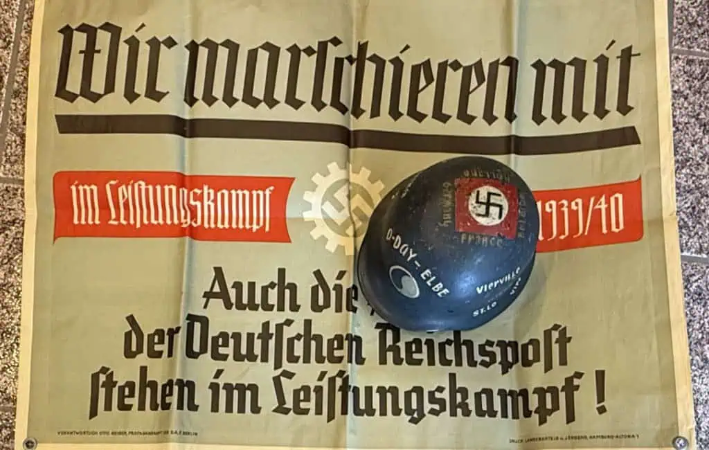 Original RARE Third Reich German DAF POSTER Certified By The Gettysburg Museum Of History. The banner is approximately 27″ X 36″ and is made of heavy-stock, one-sided paper. We placed a helmet on the last two photos for a size reference. It features the slogan. It has metal rivit rings for hanging. Very good graphics! Some pin holes (see photos) and shows only light soiling overall, with some fold marks and chaffing. The color is bright and vivid. The overall condition is excellent. Original period. very collectible in good condition. Complete museum documentation (COA) Provided. Certified by The Gettysburg Museum of History. The Gettysburg Museum of History does not support or condone Adolf Hitler or the Nazi Party and is only offering this as a historic relic. Please see our other items. Also note when browsing our web site there are several pages of items, at the bottom of the list look for other page numbers. EXCELLENT EXAMPLE!! Don’t Miss It! RARE!