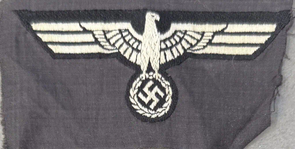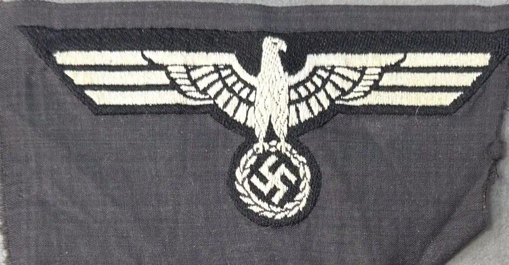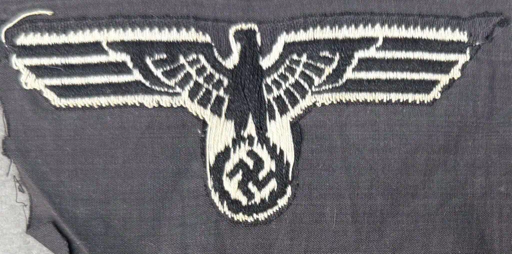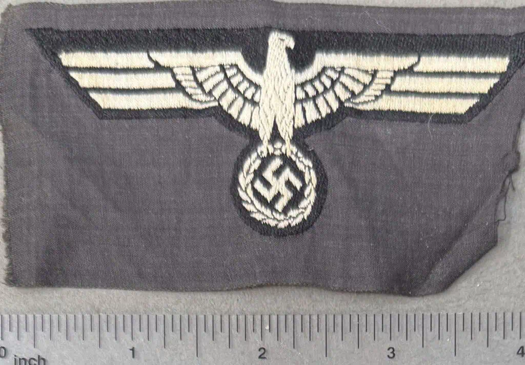 Original WWII German M36 Black Panzer Breast Eagle Certified. The German army originally adopted a slightly modified version of the NSDAP’s, Nationalsozialistische Deutsche Arbeiterpartei, (National Socialist German Worker’s Party), national eagle by order on February 17TH 1934, with instructions to have it applied to all steel helmets, visor caps, and tunics by May 1ST 1934. Later amendments to the introductory order stipulated that the national eagle was also to be worn on all field caps, the sports uniform and the black panzer wrap tunic. The eagle came in three distinct designs with two having slightly different, out-stretched wings and the third with down-swept wings. Generally, officer’s ranks utilized hand or machine embroidered breast eagles while EM/NCO’s ranks utilized machine embroidered or machine woven breast eagles. During the war the breast eagles were manufactured in a variety of slightly different manufacturing techniques and colorations. The early standard issue EM/NCO’s M36 breast eagles were in white threads and were to be abolished in 1939 to be replaced with a less visible, grey, M39 breast eagle but the changeover was never fully completed. The early produced M36 and M39 breast eagles were mounted on a dark blue/green base while later production models were on a field-grey base. Both the M36 and the M39 breast eagles were intended for wear on the combat field blouse. Of Note: Panzer versions of the breast eagle were on a black base to match the black panzer wrap uniform. Early, M36 pattern, machine woven national breast eagle with outstretched wings, clutching a wreathed, canted, swastika in it’s talons in white rayon threads on a woven, black, rayon base. The eagle’s wingspan is roughly, 10cm from wing tip to wing tip. The eagle is still on its original black rayon factory roll background. Nice example Good condition. Some storage wear (see photos). Gettysburg Museum Certified (COA) provided. Rare 100% Guaranteed to be authentic. Sold for historic purposes only. See our other pieces on our web site. Also note when browsing our web site there are several pages of items, at the bottom of the list look for other page numbers. OUTSTANDING EXAMPLE!