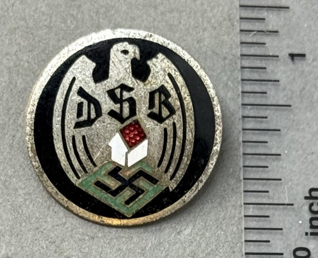 Original WWII German NSDAP (NAZI PARTY) DSB MEMBERSHIP BADGE, Certified. A third reich period DSB (Deutscher Siedlerbund/German League of Homeowners) membership badge; in silvered bronze and white, black, green, and red enamels; horizontal pinback; Maker marked on the reverse; and nicely maker marked measuring 23.30 mm in diameter; weighing 4.3 grams; with the majority of the original silver finish intact in overall good condition with some storage age and expected issues. 100% Guaranteed to be authentic Complete Museum documentation (COA) Provided. Certified by The Gettysburg Museum of History. Please see our other items. Also note when browsing our web site there are several pages of items, at the bottom of the list look for other page numbers. Great maker marked example!