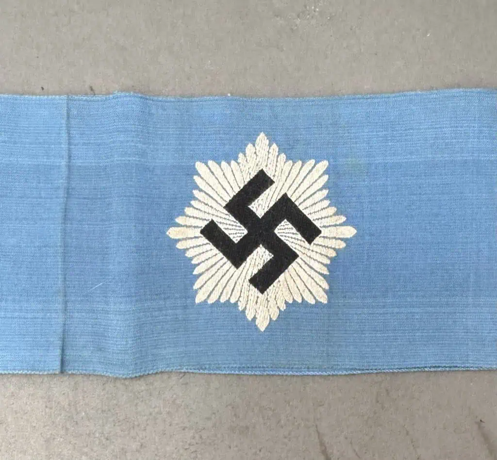 Original WWII German NSDAP (NAZI PARTY) RLB Armband. Formed in late 1932 the Deutscher Luftschutzverband (German Air Protection League), was a voluntary organization designed to provide civil air raid protection in large civilian centers. Shortly after Hitler ascension to power the Deutscher Luftschutzverband was restructured and placed under the supervision of the Reichsluftfahrtministerium, (National Ministry of Aviation), under the control of Hermann Göring. On April 29TH 1933 the Deutscher Luftschutzverband was renamed RLB, Reichs Luftschutz Bund, (National Air Raid Protection League), and was given status as an official, national, organization tasked with all aspects of civil air raid defense. The RLB remained a voluntary organization with a small cadre of paid, full-time, uniformed, officials to oversee the organizations functions until June 1935 when obligatory service was introduced. First pattern, (Circa 1933-1938), mid-blue cotton construction RLB EM/NCO’s armband features a machine woven first pattern RLB emblem to the obverse center. The RLB emblem is in the form of a forty-eight point, white, starburst pattern base with the stylized, navy-blue initials, “RLB” to the center, positioned above a small, canted, navy blue swastika. This is the VERY RARE bevo deluxe version (see photo). The armband overall is a very nice example. 100% Guaranteed to be authentic Complete museum documentation (COA) Provided. Certified by The Gettysburg Museum of History. The Gettysburg Museum of History does not support or condone Adolf Hitler or the Nazi Party and is only offering this as a historic relic. Please see our other items. Also note when browsing our web site there are several pages of items, at the bottom of the list look for other page numbers. Don’t Miss It! ONE OF THE CLASSIC THIRD REICH ARTIFACTS! A RARE BEVO VERSION OF the RLB Armband.