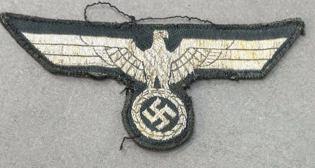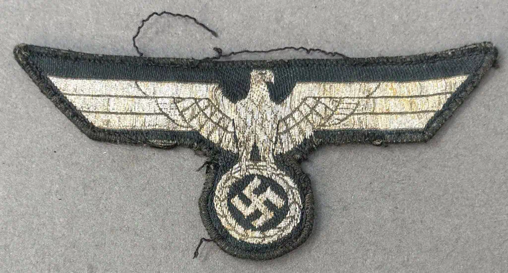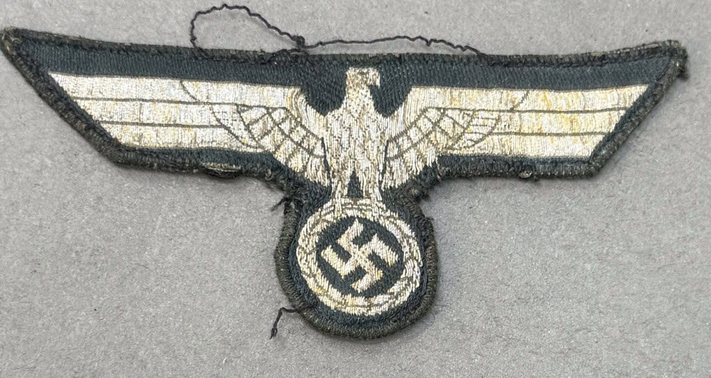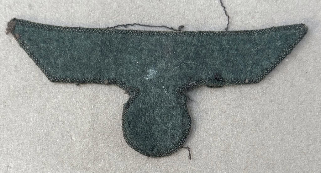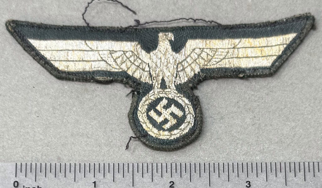 Original WWII German Army (Heer) NCO/OFFICER’S BREAST EAGLE. (Hoheitsabzeichen) Flatwire Certified. The German army originally adopted a slightly modified version of the NSDAP’s, national eagle by order on February 17TH 1934, with instructions to have it applied to all steel helmets, visor caps, and tunics by May 1ST 1934. Later amendments to the introductory order stipulated that the national eagle was also to be worn on all field caps, the sports uniform and the black panzer wrap. The eagle came in three distinct designs with two having slightly different out-stretched wings and the third with down-swept wings. Generally Officer’s ranks utilized hand or machine embroidered breast eagles while EM/NCO’s ranks utilized machine embroidered or machine woven breast eagles. During the war the breast eagles were manufactured in a variety of slightly different manufacturing techniques and colorations. Machine woven, national breast eagle with outstretched wings, clutching a wreathed, canted, swastika in its talons in bright, silver/aluminum flat-wire threads on a cut-out, woven, blue/green rayon base which is machine stitched on a blue/green badge cloth backing. Uniform removed. Typical use wear, good worn condition. Complete museum documentation (COA) Provided. Certified by The Gettysburg Museum of History. 100% guaranteed to be authentic. The Gettysburg Museum of History does not support or condone Adolf Hitler or the Nazi Party and is only offering this as a historic relic. Please see our other items. Also note when browsing our web site there are several pages of items, at the bottom of the list look for other page numbers. NICE FLATWIRE EXAMPLE! Uniform removed.