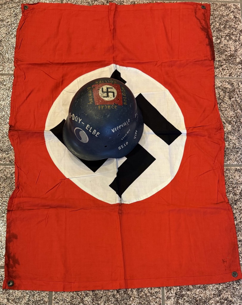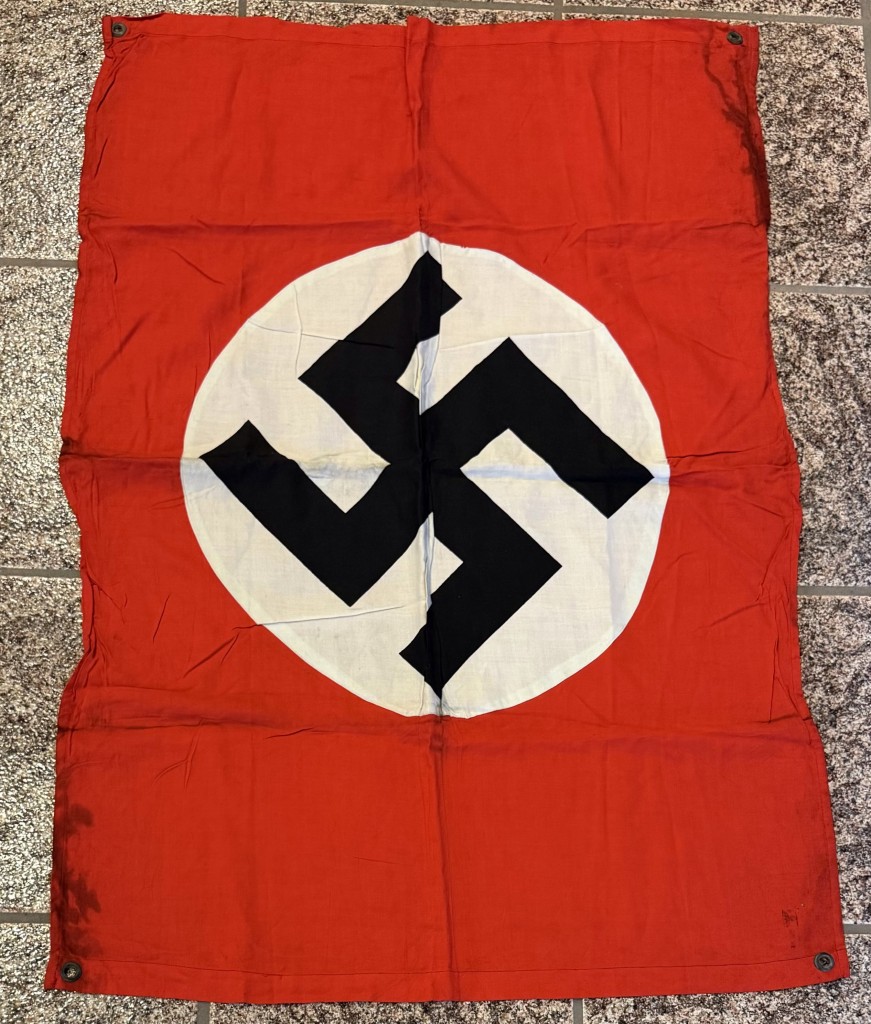 Original WWII Era German Nazi Party Vehicle Identification Flag Certified. A standard style large Cloth flag. Utilized by pretty much by all the organization of the Third Reich in one form or another. The swastika, (a Sanskrit word meaning “well-being”), is an ancient symbol that was utilized in numerous diverse cultures and signified both the cycle of life and the sun. The swastika was also a Nordic rune and the pagan Germanic symbol for Thor, God of Adventurers. In used condition single sided 26″/39! standard cotton bunting style material with separate sewn white disk and screened swastika. We placed a helmet on the flag for size reference. A fantastic piece of WWII history. Has the 4 original metal gromets for attaching to a tank or vehicle In used condition with some slight oil stains on the very edge most likely from a tank! Also a VERY RARE maker stamp (see photos) This flag is A good quality version and one of the better sizes for the most discriminating and cultivated collector. A very collectible flag with lots of history. Nice period used flag captured by a U.S. Veteran and brought home as a war trophy. Nice used example showing none of the expected age and wear . 100% Guaranteed to be authentic Brought home by a solider as a trophy of war. A very desirable size. Don’t miss this one! RARE in this size. Complete museum documentation (COA) Provided. Certified by The Gettysburg Museum of History. The Gettysburg Museum of History does not support or condone Adolf Hitler or the Nazi Party and is only offering this as a historic relic. Please see our other items. Also note when browsing our web site there are several pages of items, at the bottom of the list look for other page numbers. RARE IN THIS SIZE. OUTSTANDING EXAMPLE! NSDAP FLAGS ARE GETTING TOUGHER TO FIND! Vehicle flags are desirable because they are true combat used flags and vehicle flags are RARE! REALY OUTSTANDING COMBAT USED VERSION!