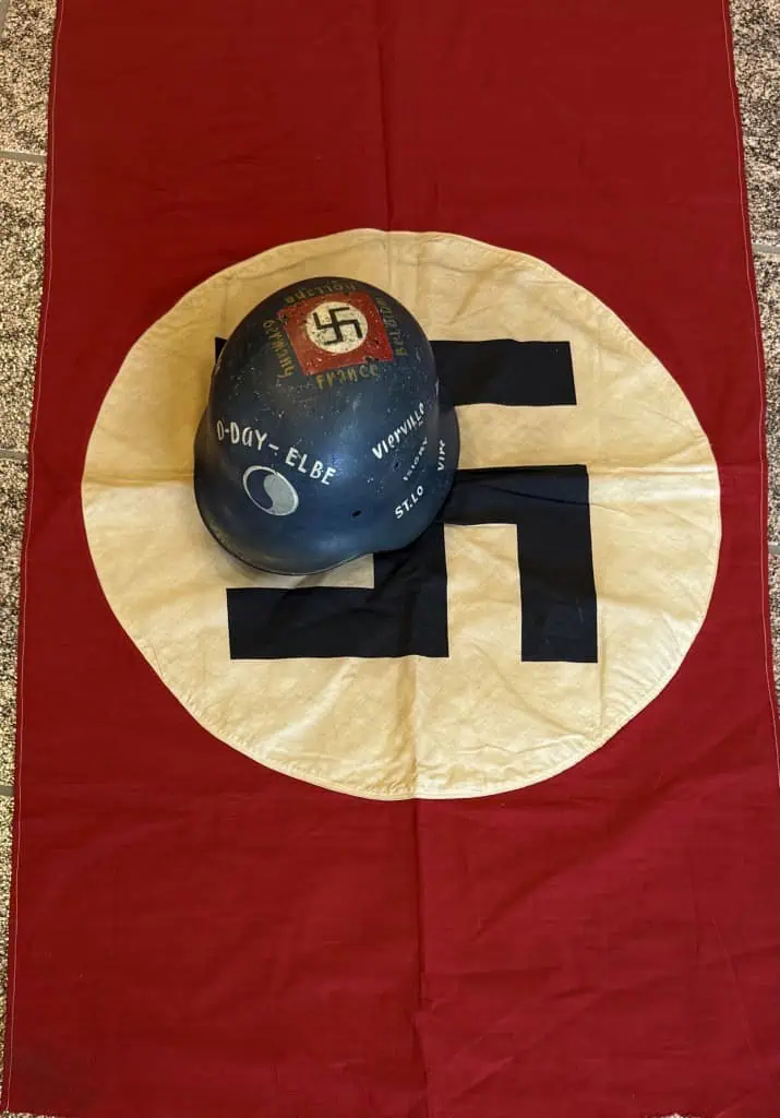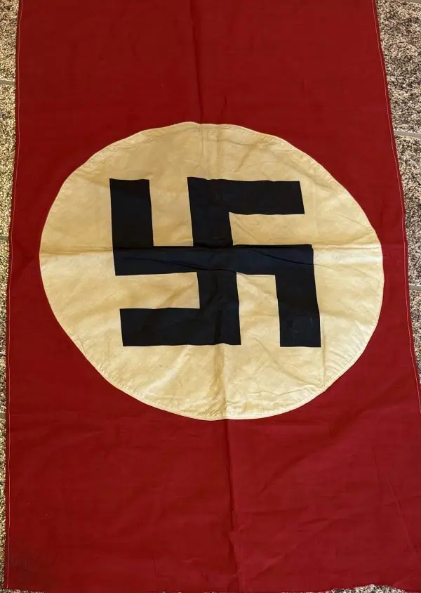 Original EARLY RARE Pre-WWII German Nazi Party Flag Certified. A standard style Cloth banner type flag. Utilized by pretty much by all the organization of the Third Reich in one form or another. The swastika, (a Sanskrit word meaning “well being”), is an ancient symbol that was utilized in numerous diverse cultures and signified both the cycle of life and the sun. The swastika was also a Nordic rune and the pagan Germanic symbol for Thor, God of Adventurers. In good condition double sided 25″/44″! we placed a helmet on one photo for a size comparison. standard cotton bunting style material with screened swastika and sewn disk. In the early days of the NSDAP before flags were fitted with a square swastika instead of a slanted one. this example! From the early days of “The Struggle”. Dates to the late 1920’s to early 1930’s ! A fantastic piece of Third Reich history good condition with storage wear, a few stains, no fading (see photos) This flag is A good quality version and one of the better displayable sizes for the most discriminating and cultivated collector. Even with the minor condition issues it Overall a very collectible flag with lots of history Nice period used flag captured by a U.S. Veteran and brought home as a war trophy. Nice used example showing the expected age . 100% Guaranteed to be authentic Brought home by a solider as a trophy of war. A very desirable size in good condition an outstanding example. Don’t miss this one! RARE in this size. Complete museum documentation (COA) Provided. Certified by The Gettysburg Museum of History. The Gettysburg Museum of History does not support or condone Adolf Hitler or the Nazi Party and is only offering this as a historic relic. Please see our other items. Also note when browsing our web site there are several pages of items, at the bottom of the list look for other page numbers. RARE IN THIS SIZE. Good EARLY EXAMPLE! NSDAP FLAGS ARE GETTING TOUGHER TO FIND! Don’t Miss It!!!! RARE, Good but used Condition!