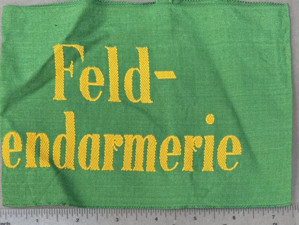 Original VERY RARE WWII German Army Feldgendarmerie, (Military Field Police) Armband (Ärmelbinde). The Feldgendarmerie, (Military Field Police), units were established on mobilization of the army in August 1939 and drew the majority of its personnel from the civil Ordnungspolizei, (Order Police), as they were already familiar with policing regulations and tasks. The Feldgendarmerie were assigned a wide variety of tasks that included, military traffic control, maintaining discipline and compliance of orders of the troops, the apprehension of stragglers and deserters, escorting POW’s, control of the civilian population, securing communication and supply lines, anti-partisan suppression and control of any disorder in the occupied rear areas of battle among other duties. The Feldgendarmerie were also empowered with the authority to perform location and personal searches and could demand required assistance from any military or civilian personnel. The Feldgendarmerie’s authority extended to the point that Feldgendarmerie’s ranks out-ranked similar military personnel’s ranks. As an expedient measure the Feldgendarmerie personnel originally wore police uniforms with army insignia added but by late 1939 or early 1940 they were issued army uniforms with distinct identifying insignia including a duty Gorget, a cufftitle and a police sleeve badge for wear by all ranks. When required Feldgendarmerie personnel were authorized to enlist EM/NCO’s from other branches of service to temporarily assist them in their policing duties. When EM/NCO’s from other branches of service were enlisted to assist the Feldgendarmerie they were supplied with an identifying armband for wear on the upper left sleeve of the field blouse or greatcoat. The armband was only worn during active policing duties and was to be returned to the Feldgendarmerie issuing authority on completion of the service.  Roughly, 13cm tall, 36cm long, woven, mid-green rayon construction armband with embroidered woven, black, Latin script in two lines to the obverse, “Feld-Gendarmerie”, (Military Field Police), in yellow threads. Both the top and bottom edges of the armband have interwoven rows of reinforcement stitching and the reverse of the armband has a machine stitched, central, vertical, seam. Rare to see in machine embroidered as most where machine   In good condition, good colors. NEAR MINT  Nice U.S. Veteran bring back arm band.   Gettysburg Museum Certified (COA) provided. Rare100% Guaranteed to be authentic. Sold for historic purposes only. See our other pieces on our web site.   Also note when browsing our web site there are several pages of items, at the bottom of the list look for other page numbers. A VERY SCARCE ARMBAND!