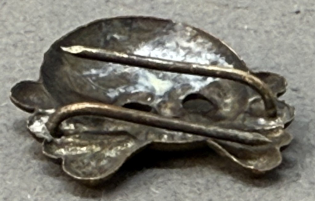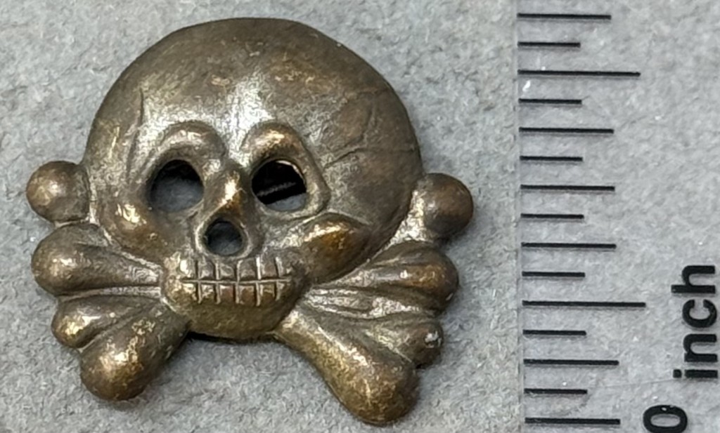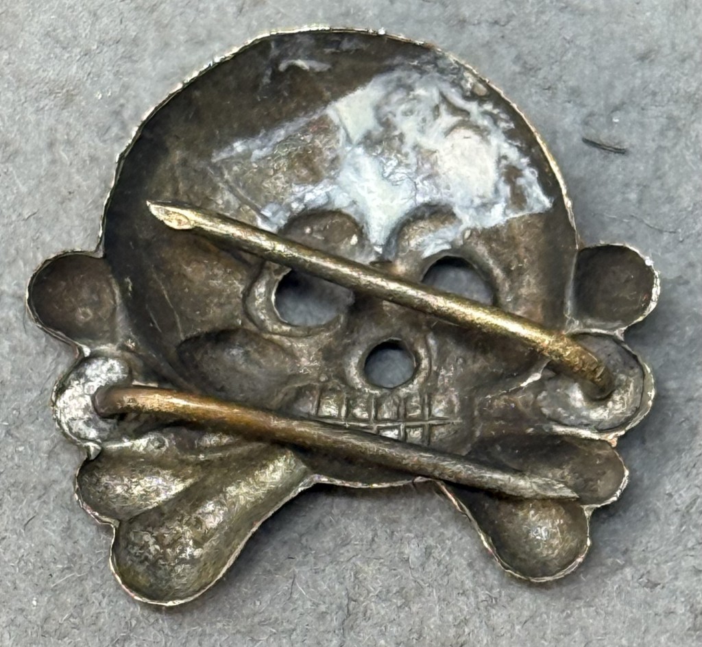 Original VERY RARE WWII German Army (Heer) PANZER TROOPS COLLAR TAB SKULL. (Kragenspiegel Totenköpfe) Certified. The use of collar ornamentation on military uniforms was utilized by numerous assorted nations with the main function being the indication of the wearers rank and/or branch of service. In November 1934 the Germans introduced the black Panzer wrap tunic for the newly formed armored units and it was worn through-out the war with minor modifications in 1936 and 1942. Along with the new black Panzer wrap tunic the Germans also introduced the unique Panzer collar tabs which utilized the old Prussian “Danziger” style skull and crossbones. The skulls and crossbones were worn through-out the war with minor manufacturing variations. The different branches of service within the German army were allocated a particular identifying waffenfarbe, (Branch of Service Color), which was generally displayed on the collar tabs with pink being chosen for Panzer, (Armored), personnel. Of Note: The general waffenfarbe for all armored units was pink although other colors were utilized including red for armored artillery units, golden yellow for armored reconnaissance units and the 24TH Panzer Division, lemon yellow for armored signals units and, for a short time, alternating black and white for armored engineer units. Also Of Note: The “Danziger” style skull and crossbones were also worn on the field-grey Assault Artillery wrap tunic. silver washed, stamped EARLY TOMBAC construction, Prussian “Danziger” style skulls and crossbones feature circular eye and triangular nose cut-outs, embossed cranium detailing and dual rows of teeth with no bottom jaw. Both of the two prongs is intact. 100% Guaranteed to be authentic. Complete museum documentation (COA) Provided. Please see our other German Medals and Relics From WWII. Also note when browsing our web site there are several pages of items, at the bottom of the list look for other page numbers.   OUTSTANDING Don’t miss it! VERY EARLY TOMBAC Version! OUTSTANDING!