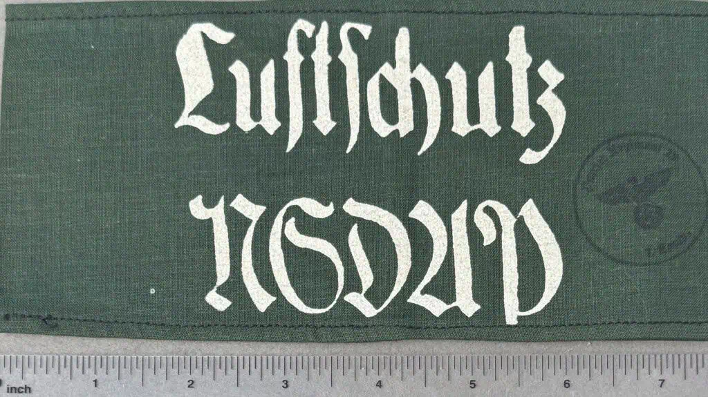 Original VERY RARE WWII German NSDAP (NAZI PARTY) Luftschutz Armband with Ink Stamp Certified. Formed in late 1932 the Deutscher Luftschutzverband, (German Air Protection League), was a voluntary organization designed to provide civil air raid protection in large civilian centers. Shortly after Hitler ascension to power the Deutscher Luftschutzverband was restructured and placed under the supervision of the Reichsluftfahrtministerium, (National Air Ministry), under the control of Hermann Göring. On April 29TH 1933 the Deutscher Luftschutzverband was renamed RLB, Reichs Luftschutz Bund, (National Air Raid Protection League) and was given status as an official national organization tasked with all aspects of civil air raid defence. The RLB remained a voluntary organization with a small cadre of paid, full-time, uniformed officials to oversee the organizations functions until June 1935 when obligatory service was introduced. Only the most basic uniform and equipment items were supplied to the cadre personnel, with the rest having to be bought personally by members. Original Item: Only One Available. Air Defense NSDAP worn by worn by civilian volunteers organized through their local NSDAP Ortsgruppen. This excellent example is made of cotton linen material, medium green with white lettering. Overall good used condition with very minor wear. Measures approximately 4″ wide . Has a rare stamp. A very rare armband! Typical storage wear, . Complete museum documentation (COA) Provided. Certified by The Gettysburg Museum of History. 100% guaranteed to be authentic. The Gettysburg Museum of History does not support or condone Adolf Hitler or the Nazi Party and is only offering this as a historic relic. Please see our other items. Also note when browsing our web site there are several pages of items, at the bottom of the list look for other page numbers. VERY RARE DO NOT MISS THIS