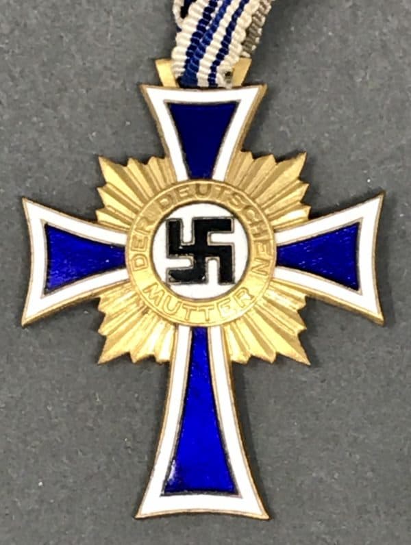 Original German Mother’s Cross Ehrenkreuz der Deutschen Mutter In GOLD. The Mother’s Cross was introduced by Adolf Hitler on December 16TH 1938 as part of a large propaganda campaign aimed at increasing the birth rate. The award was officially designated, Honor Cross of the German Mother, and was instituted in three grades to recognize and reward child bearing German females. The three grades consisted of the bronze cross for bearing four or five children, the silver cross for bearing six or seven children and the gold cross for bearing eight or more children. Criteria for the award included that the parents be of pure German blood, and that the mother was worthy of such an honor. two piece, stamped tombac award with a gold wash and blue and white enamel work. Award in the form of a Christian cross with outward fluted arms in semi-translucent blue enamel with white enamel border. Cross has a raised sunburst pattern emanating between its arms. Separate central circular field with white enamel base and black static swastika, encompassed by a circular border with embossed Latin script, “Der Deutschen Mutter”, (The German Mother). Reverse has impressed simulated handwritten script, “16 December 1938”, and facsimile Hitler signature. A long complete section of original ribbon is also included see photo. Excellent condition with some very light wear and storage age expected issues (see photo) . 100% Guaranteed to be authentic Complete museum documentation (COA) Provided. Certified by The Gettysburg Museum of History. Offer is for one (1) GOLD Mother Cross as pictured. Please see our other Mother Crosses and other items. Also note when browsing our web site there are several pages of items, at the bottom of the list look for other page numbers. NICE EXAMPLE GOOD CONDITION!
