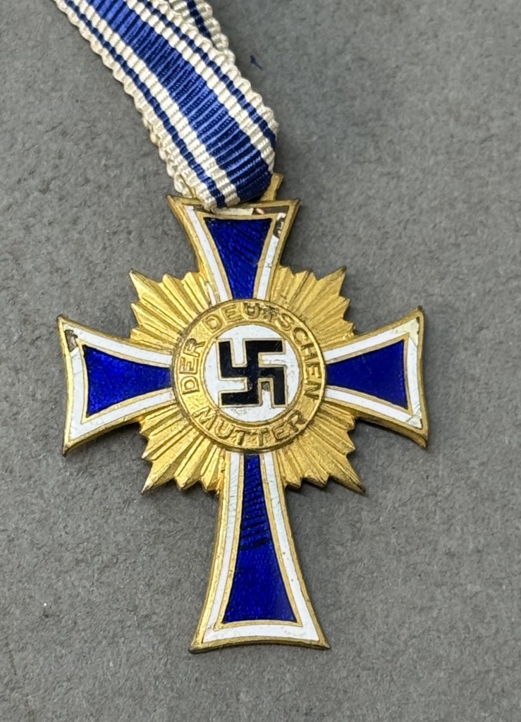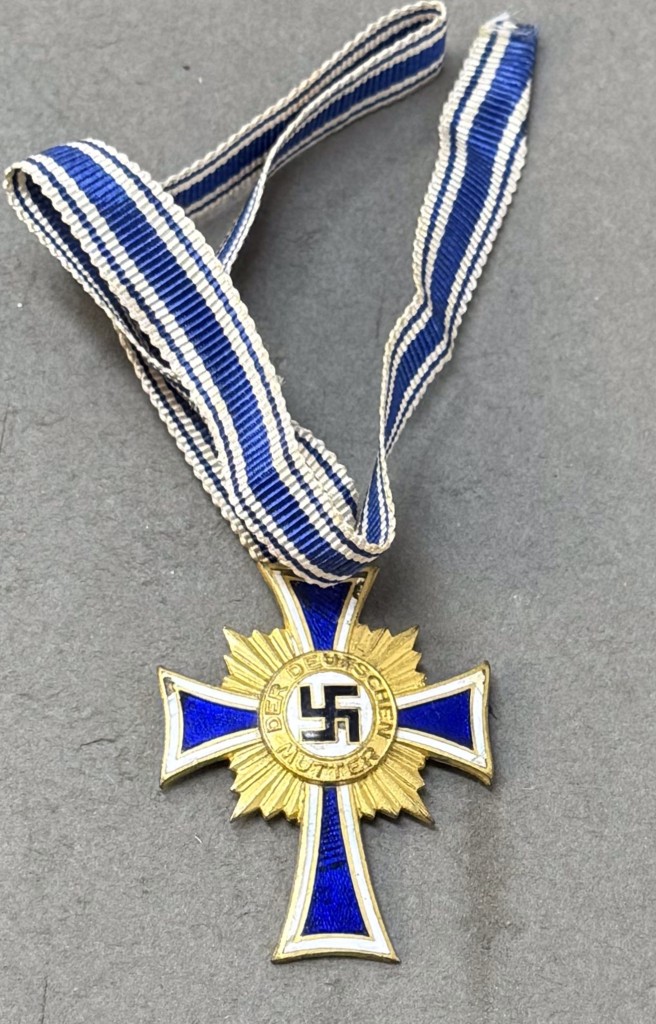 Original German Mother’s Cross Ehrenkreuz der Deutschen Mutter In GOLD. The Mother’s Cross was introduced by Adolf Hitler on December 16TH 1938 as part of a large propaganda campaign aimed at increasing the birth rate. The award was officially designated, Honor Cross of the German Mother, and was instituted in three grades to recognize and reward childbearing German females. The three grades consisted of the bronze cross for bearing four or five children, the silver cross for bearing six or seven children and the gold cross for bearing eight or more children. Criteria for the award included that the parents be of pure German blood, and that the mother was worthy of such an honor. Two-piece, stamped tombac award with a gold wash and blue and white enamel work. Award in the form of a Christian cross with outward fluted arms in semi-translucent blue enamel with white enamel border. Cross has a raised sunburst pattern emanating between its arms. Separate central circular field with white enamel base and black static swastika, encompassed by a circular border with embossed Latin script, “Der Deutschen Mutter”, (The German Mother). Reverse has impressed simulated handwritten script, “16 December 1938”, and facsimile Hitler signature. A  section of original ribbon is also included see photo. Excellent condition with some very light wear and storage age expected issues (see photos).  100% Guaranteed to be authentic Complete Museum documentation (COA) Provided. Certified by The Gettysburg Museum of   History. Please see our other Mother Crosses and other items.  Also note when browsing our web site there are several pages of items, at the bottom of the list look for other page numbers. NICE EXAMPLE GOOD USED CONDITION Some loss (see photos).