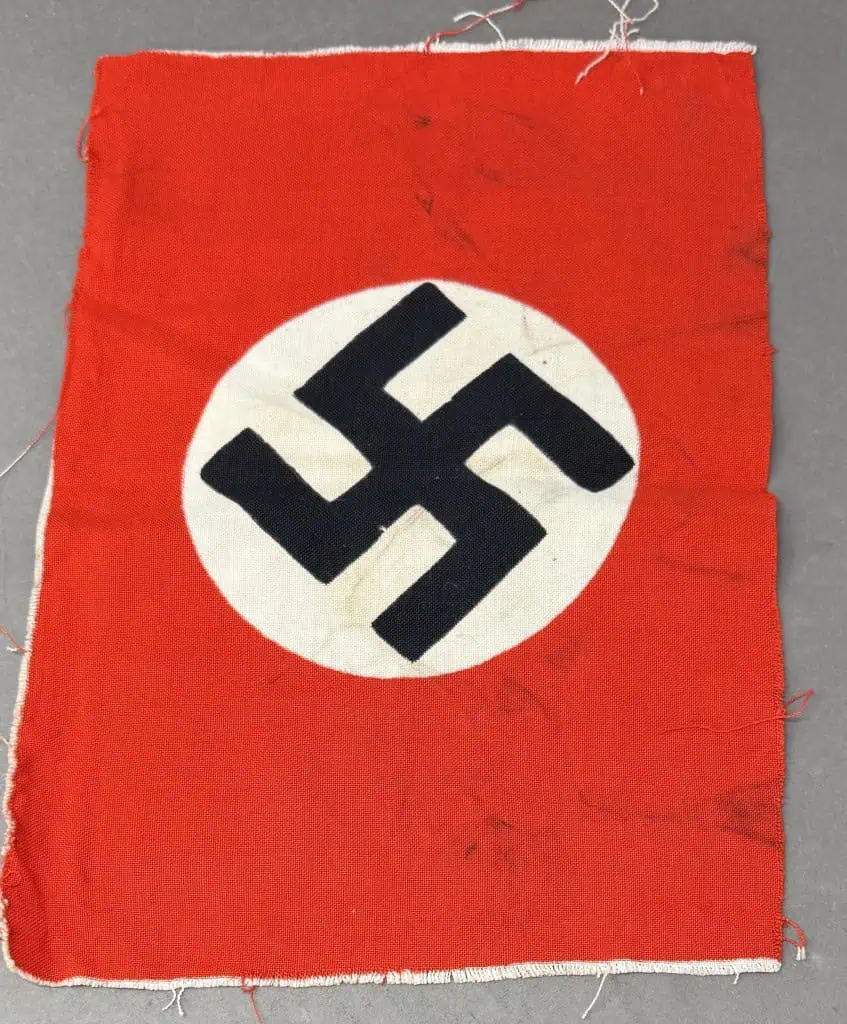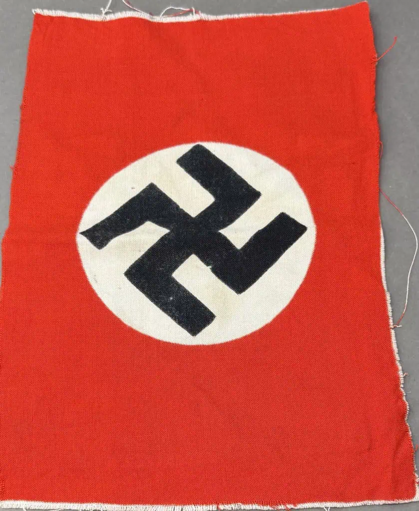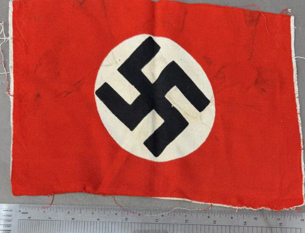 Original WWII Era German Nazi Party Flag Certified. A standard style Cloth banner type flag. Utilized by pretty much by all the organization of the Third Reich in one form or another. The swastika, (a Sanskrit word meaning “well-being”), is an ancient symbol that was utilized in numerous diverse cultures and signified both the cycle of life and the sun. The swastika was also a Nordic rune and the pagan Germanic symbol for Thor, God of Adventurers. In good but used condition 8″/12″! standard cotton bunting style material with screened white disk and a screened swastika. A fantastic piece of WWII history. This flag is A standard quality version and one of the better displayable sizes for the most discriminating and cultivated collector. Even with the minor condition issues it Overall a very collectible flag with lots of history. Nice period used flag captured by a U.S. Veteran and brought home as a war trophy. Nice used example showing the expected age. 100% Guaranteed to be authentic Brought home by a solider as a trophy of war. A very desirable size Don’t miss this one! RARE in this size. Complete museum documentation (COA) Provided. Certified by The Gettysburg Museum of History. The Gettysburg Museum of History does not support or condone Adolf Hitler or the Nazi Party and is only offering this as a historic relic. Please see our other items. Also note when browsing our web site there are several pages of items, at the bottom of the list look for other page numbers. RARE IN THIS SIZE. Good EXAMPLE! NSDAP FLAGS ARE GETTING TOUGHER TO FIND! Don’t Miss It!!!! RARE, good used Condition (see photos)