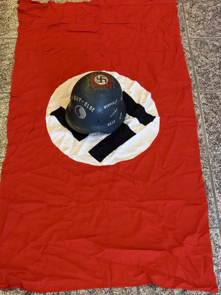 Original WWII Era German Nazi Party Flag Certified. A standard style Cloth banner type flag. Utilized by pretty much by all the organization of the Third Reich in one form or another. The swastika, (a Sanskrit word meaning “well-being”), is an ancient symbol that was utilized in numerous diverse cultures and signified both the cycle of life and the sun. The swastika was also a Nordic rune and the pagan Germanic symbol for Thor, God of Adventurers. In good but used condition double sided 29″/55″! standard cotton bunting style material with screened white disk and multi-piece swastika. A fantastic piece of WWII history. This flag is A standard quality version and one of the better displayable sizes for the most discriminating and cultivated collector. Even with the minor condition issues it Overall a very collectible flag with lots of history. Nice period used flag captured by a U.S. Veteran and brought home as a war trophy. Nice used example showing the expected age. 100% Guaranteed to be authentic Brought home by a solider as a trophy of war. A very desirable size Don’t miss this one! RARE in this size. Complete museum documentation (COA) Provided. Certified by The Gettysburg Museum of History. The Gettysburg Museum of History does not support or condone Adolf Hitler or the Nazi Party and is only offering this as a historic relic. Please see our other items. Also note when browsing our web site there are several pages of items, at the bottom of the list look for other page numbers. RARE IN THIS SIZE. Good EXAMPLE! NSDAP FLAGS ARE GETTING TOUGHER TO FIND! Don’t Miss It!!!! RARE, good used Condition (see photos) Almost mint!